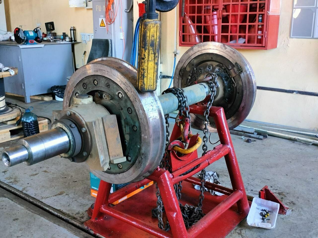 Специальных заводских приспособлений для замены бандажей у предприятия нет, поэтому механики действуют по принципу «где смекалка — там и решение». Подбирают инструмент, изготавливают самодельные съёмники, используют гидравлический насос высокого давления — всё, чтобы аккуратно снять старый бандаж и установить новый, не повредив дорогие узлы.