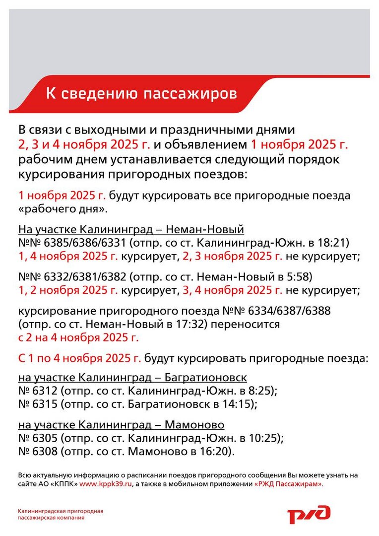 На Багратионовском направлении с 1 по 4 ноября назначаются два пригородных поезда: с Южного вокзала — в 8:25 и из Багратионовска — в 14:15.