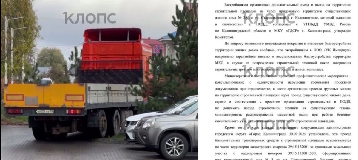 В официальном ответе за подписью заместителя председателя правительства Калининградской области Сергея Булычева указано, что проезд техники осуществляется по согласованному проекту, утверждённому ГАИ и муниципальным предприятием «Городское дорожное строительство и ремонт». По словам чиновника, работники городской администрации проводили выездные проверки и на месте нарушений не зафиксировали — газоны и насаждения находились «в надлежащем состоянии».