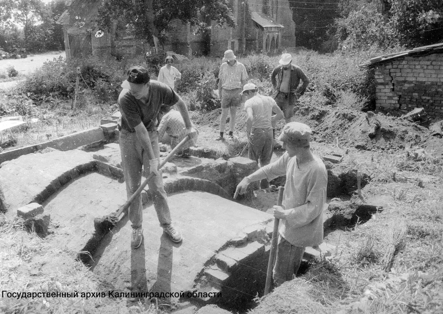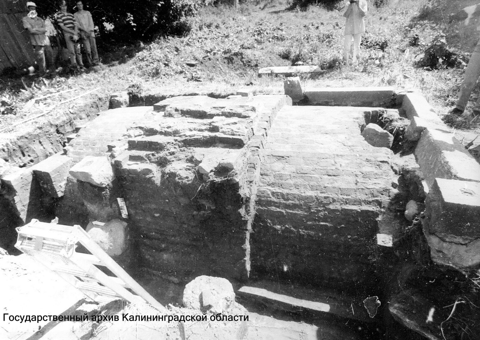 Археологи раскопали склеп и нашли в нём три скелета. Один принадлежал видному немецкому политику, а два других — женщинам. Все останки вернули на место, сверху установили памятник. Надпись на правой стене гласила: «Прогрессивному государственному и политическому деятелю, ученику Канта, обер-президенту Восточной Пруссии первой половины XIX века», а сверху было написано «Теодор фон Шен 1773-1856 Theodor von Schon».