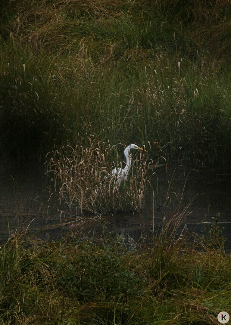 В прошлом году в Краснолесье повезло повстречать белую цаплю. На закате они шли с мужем к роднику, как вдруг увидели посреди разлива изящный силуэт. Цапли очень пугливы, но людей скрывали туман и ветви деревьев, так что удалось её не потревожить. Получилась целая серия удивительно красивых, почти мистических снимков.