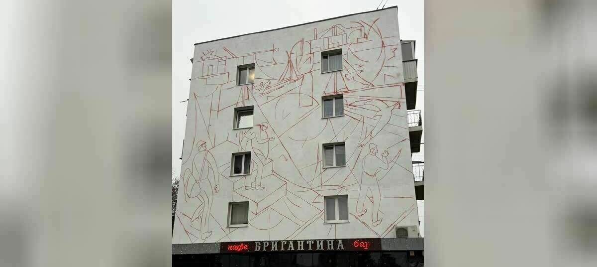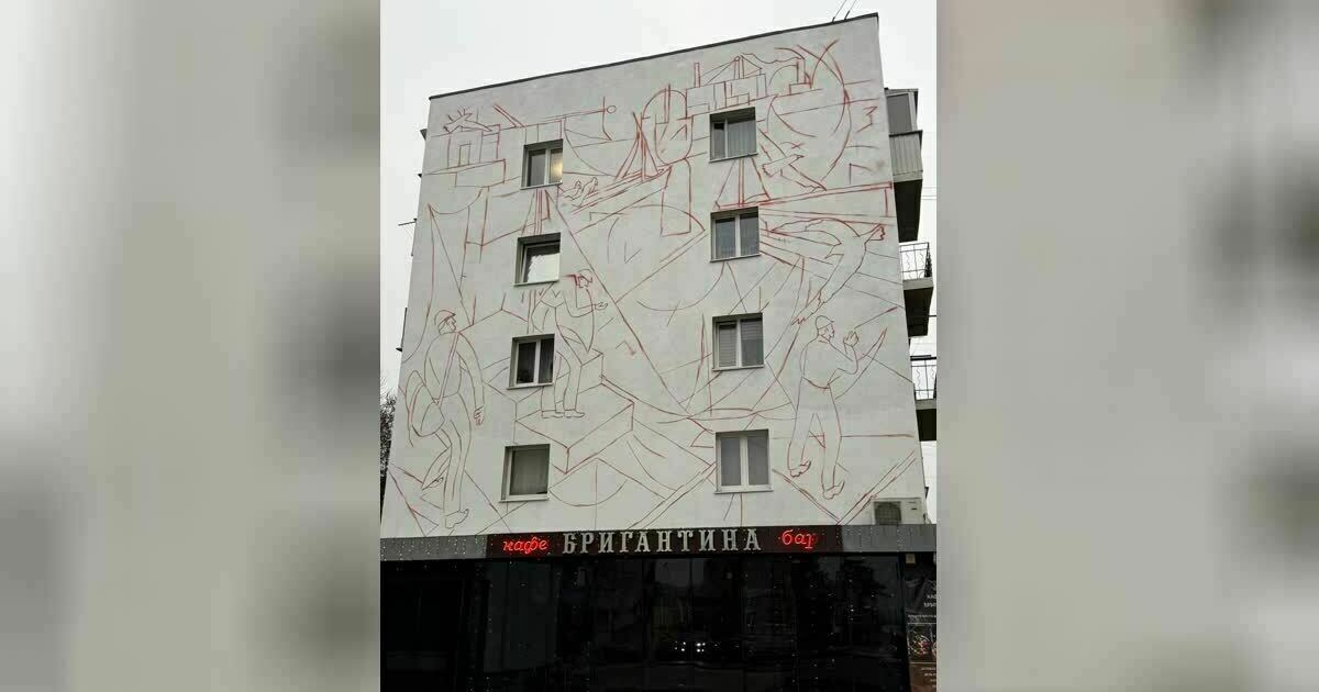 К работе над композицией он приступил в понедельник, 10 ноября. На здание уже нанесены контуры фигур, и можно получить представление, как будет выглядеть стена в будущем. Инициатором проекта стала администрация города, концепцию придумывали и утверждали около полугода.