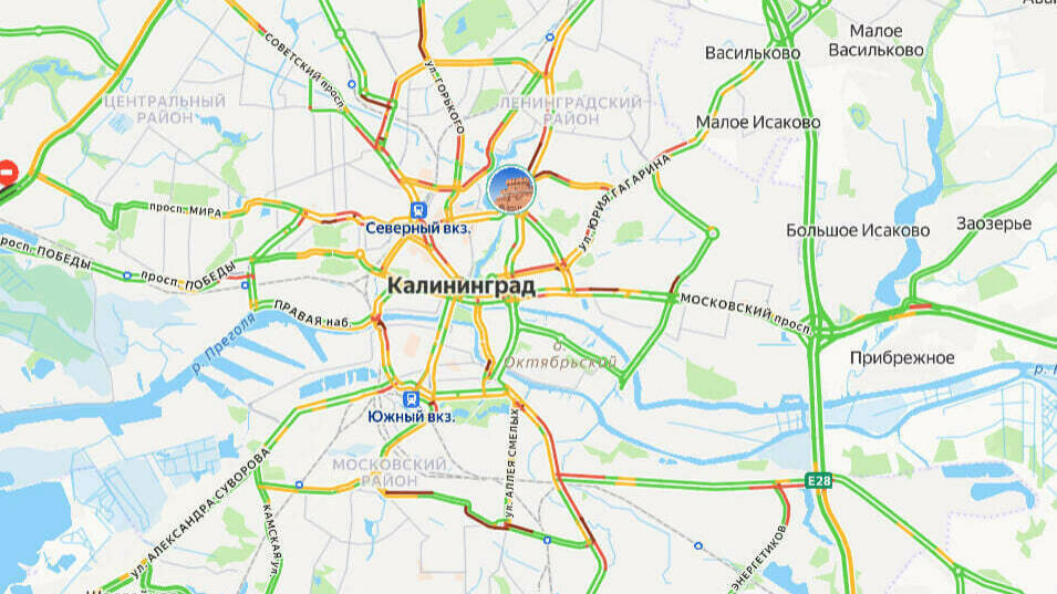 Движение затруднено на основных магистралях города, в том числе на Горького, Портовой, Железнодорожной, Гагарина, Емельянова, Судостроительной, Невского, Черняховского, Фрунзе, 9 Апреля, Ленинском, Московском и Советском проспектах. О ДТП не сообщается. Общая дорожная ситуация в Калининграде оценивается в семь баллов.