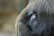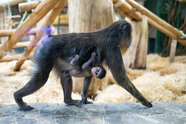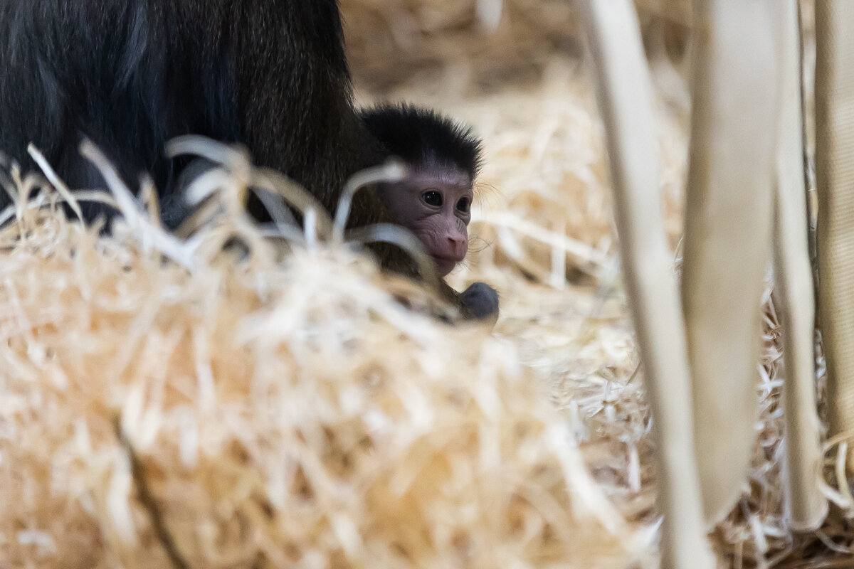 Юный обитатель зоопарка проводит всё время на матери, крепко вцепившись в её шерсть и питаясь только маминым молоком. К трём месяцам детёныш начнёт пробовать взрослую пищу.