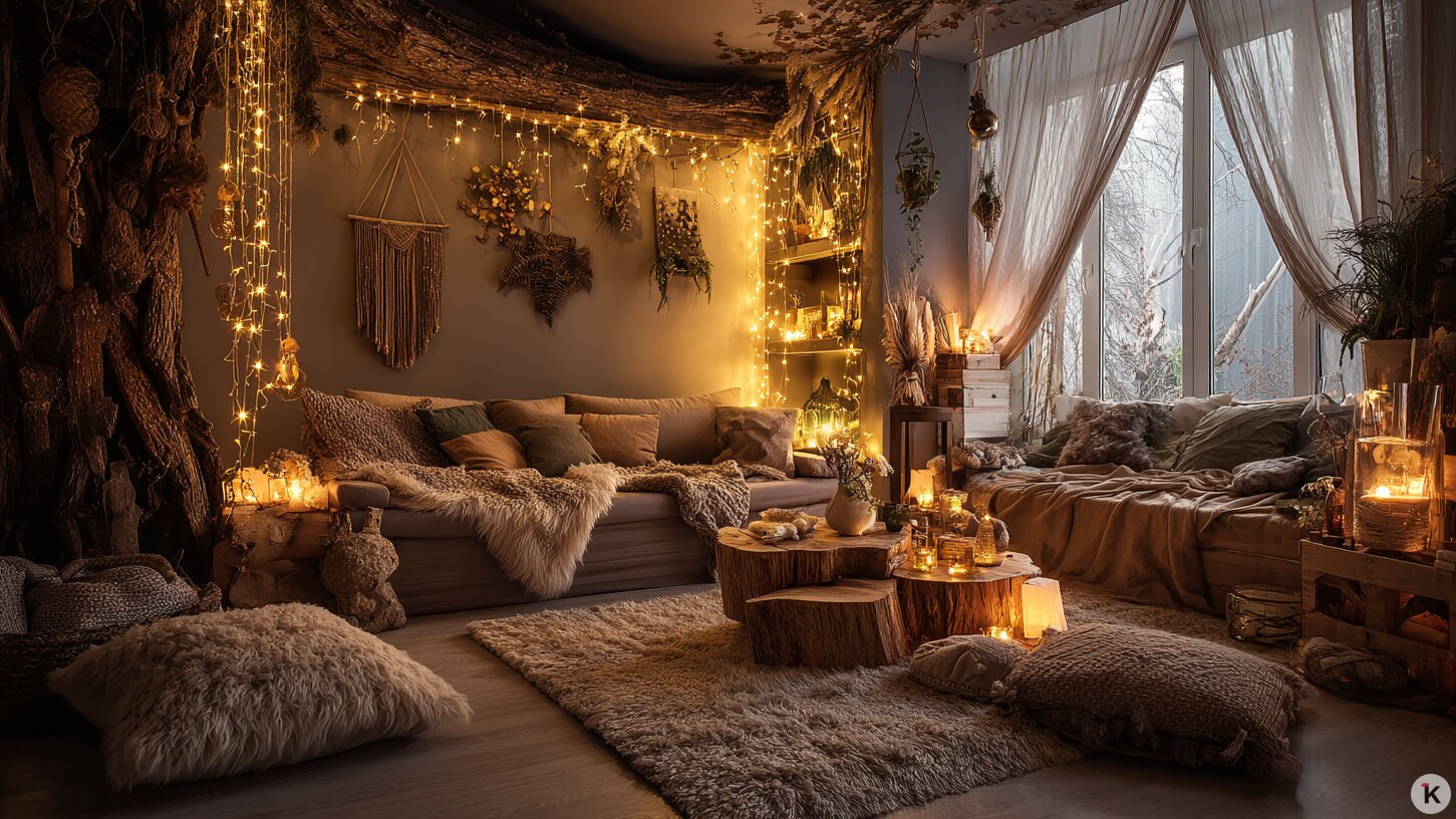 - Спокойное и тёплое — мягкий свет сотен маленьких лампочек, натуральные ветки, шишки, шерстяные пледы и «ощущение, будто сидишь у камина, хотя за окном Балтика и +3 °С».