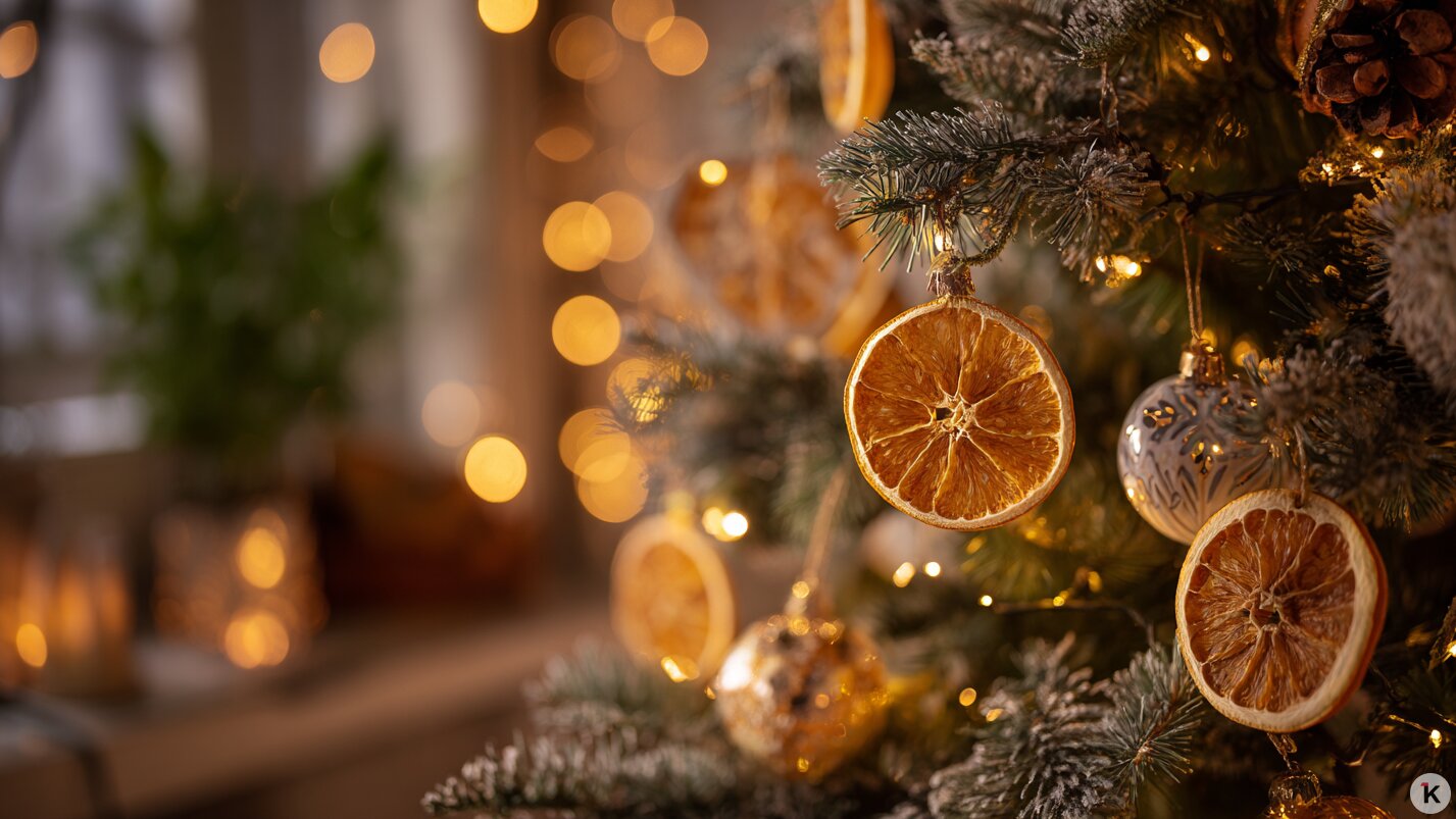 - натуральные украшения: дольки сушёных апельсинов, палочки корицы, шишки, кусочки янтаря на нитке;