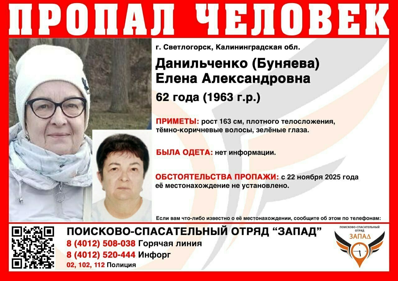 В Светлогорске ищут 62-летнюю Елену Данильченко (Буняеву), которая пропала три дня назад. Об этом сообщает ПСО «Запад».