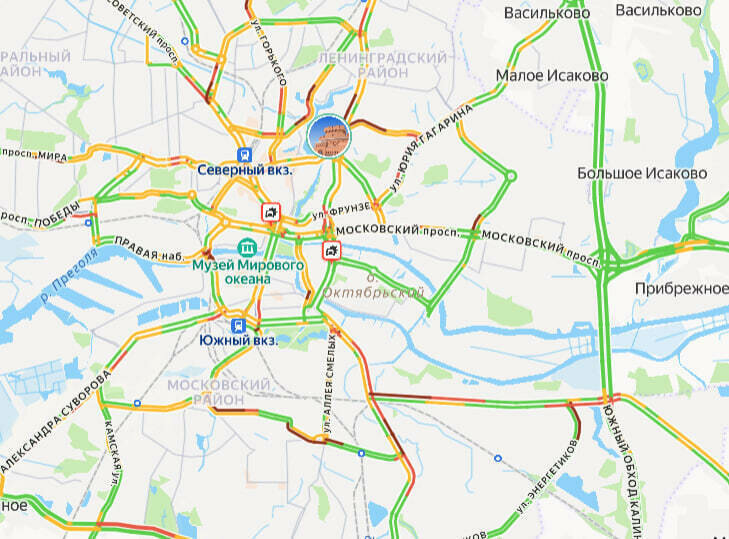 Движение затруднено на основных магистралях города, в том числе на Горького, Портовой, Железнодорожной, Гагарина, Емельянова, Судостроительной, Невского, Черняховского, Фрунзе, 9 Апреля, Ленинском, Московском и Советском проспектах. Сообщается о двух ДТП — на Московском проспекте и Втором эстакадном мосту. Общая дорожная ситуация в Калининграде оценивается в восемь баллов.