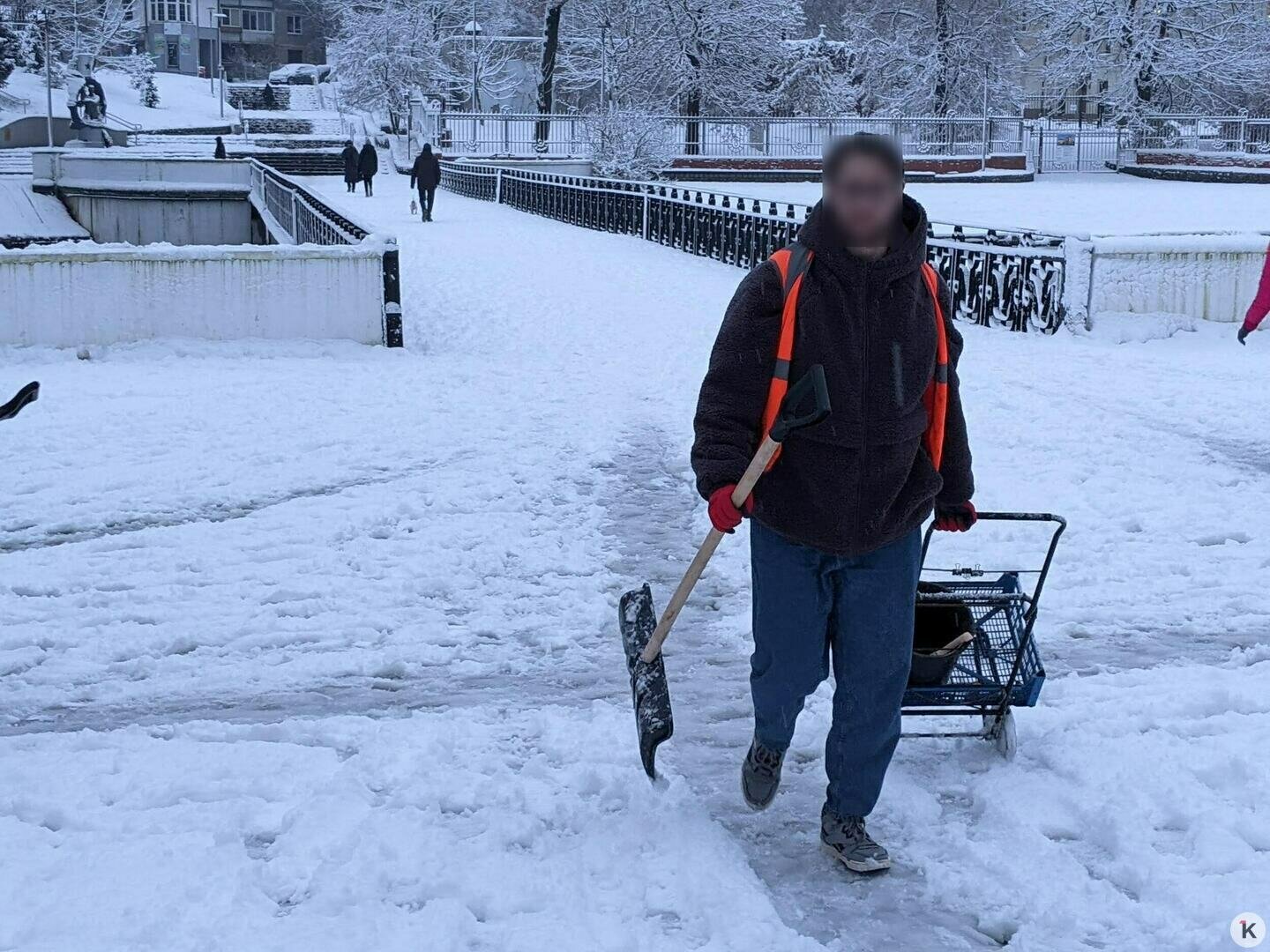 На Рокоссовского — зимняя сказка: дремлют заваленные пушистыми хлопьями электросамокаты на мини-парковке, в снежном убранстве ветки дубов и рябин. Дворник замечен один, почти у самого подъёма к Черняховского: женщина хмуро счищает заносы со скамьи. Пешеходная аллея вся в снегу. Виднеются следы от трактора, но не более.