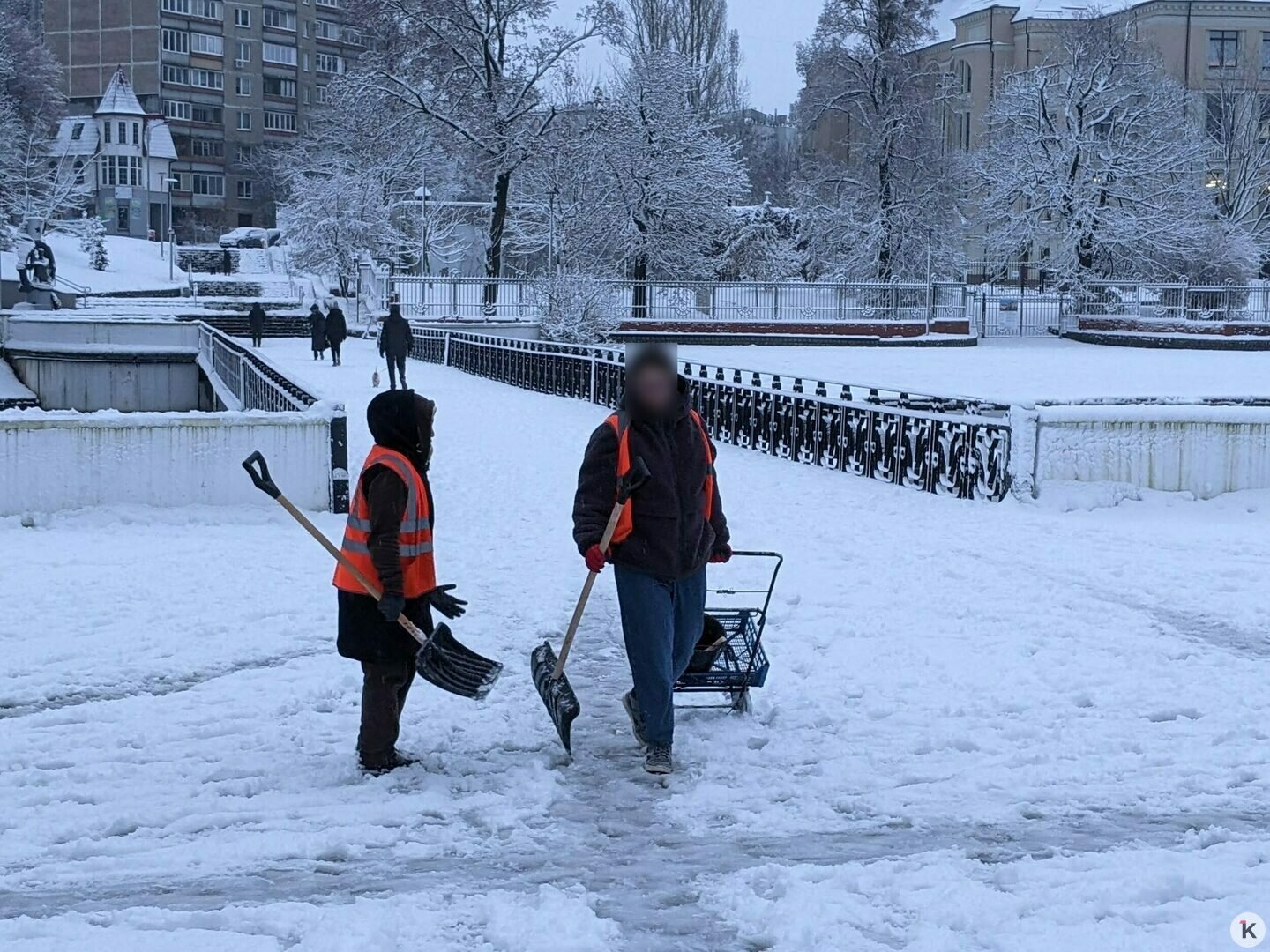 На набережной Маринеско уборка явно начиналась: очищены несколько пролётов лестницы. По мосту печально прогуливаются мужчина и женщина в оранжевых жилетах, в руках лопаты, на тележке пустое ведро. Похоже, оценивают фронт бесконечных работ. А снег продолжает идти.