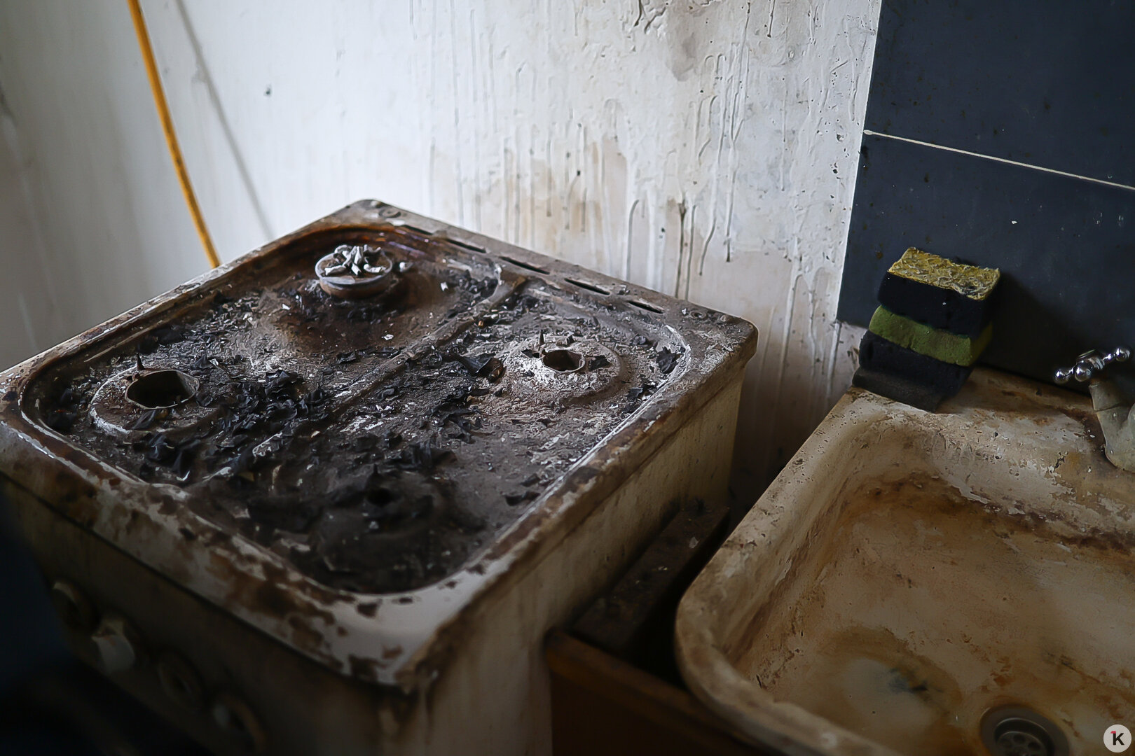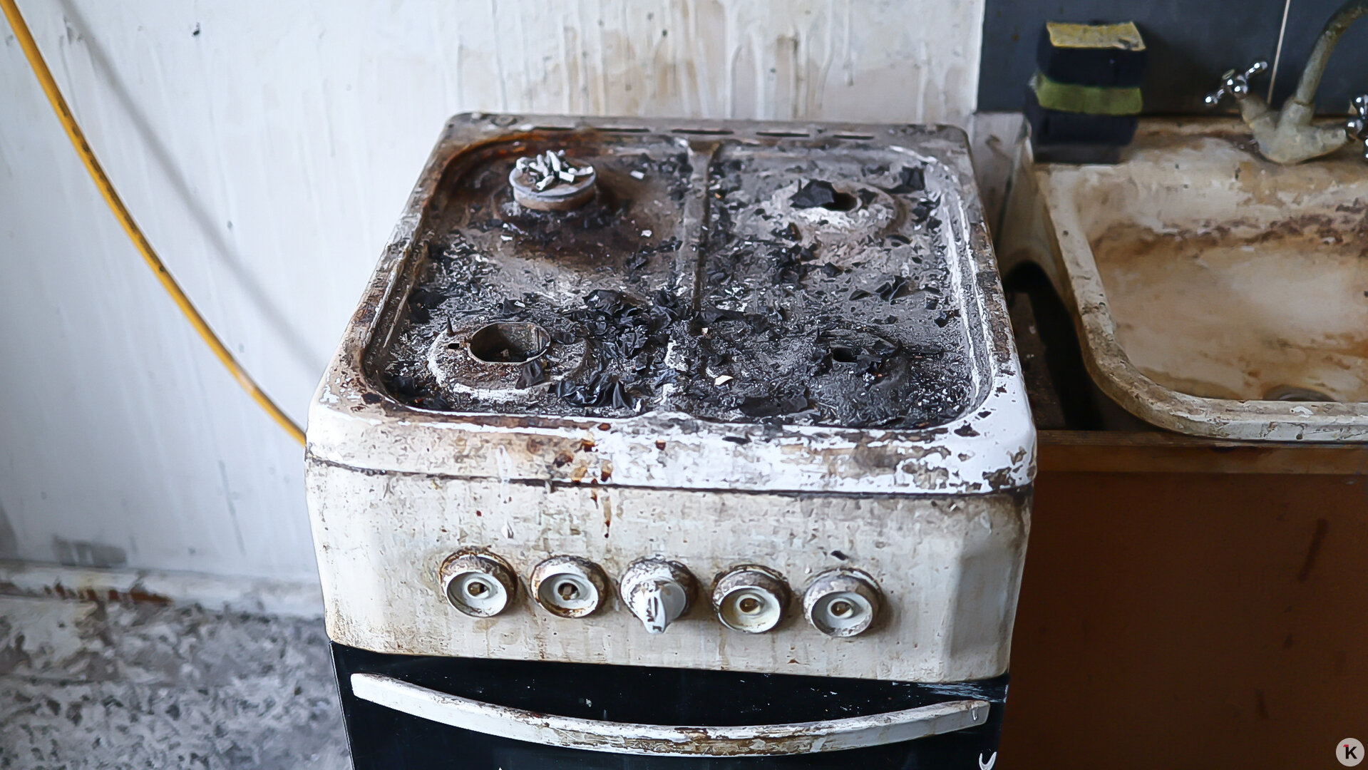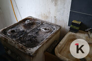 Поверхность грязной газовой плиты засыпана пеплом и остатками сгоревшей бумаги. «Это в среду вечером было, — рассказывает соседка. — Пришла вечером с супом, там кромешная темнота... Я Мише сказала, что ещё принесу сейчас чай.