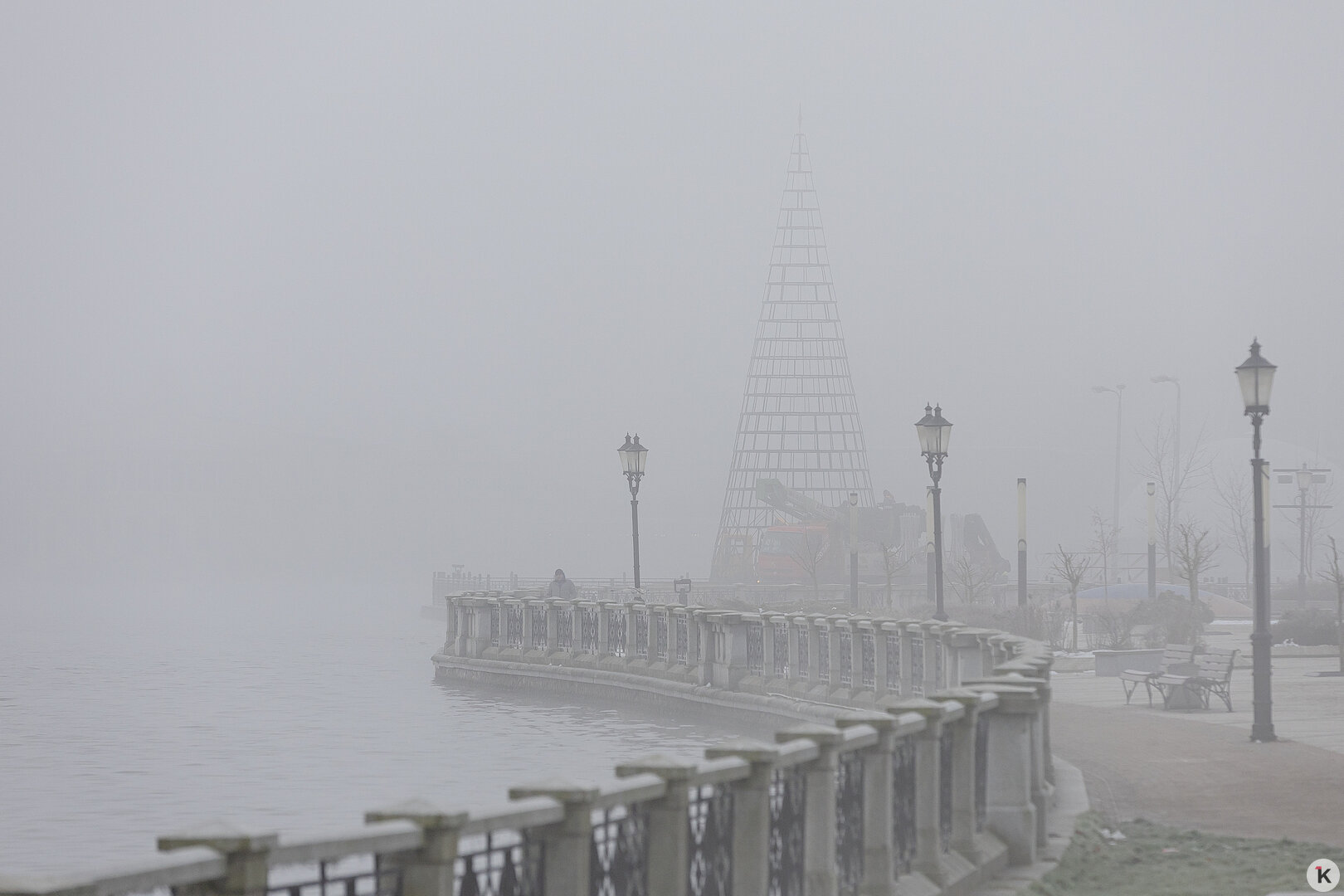 Фото дня: установка ёлки на Верхнем озере в туманном Калининграде
