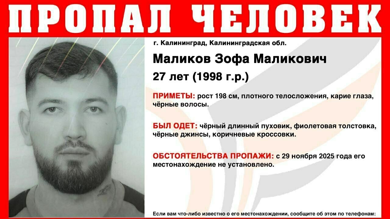 Зофа Маликов ростом 198 см, плотного телосложения. У него карие глаза и чёрные волосы. Пропавший был одет в чёрный длинный пуховик, фиолетовую толстовку, чёрные джинсы и коричневые кроссовки. Мужчину ищут с 29 ноября 2025 года.