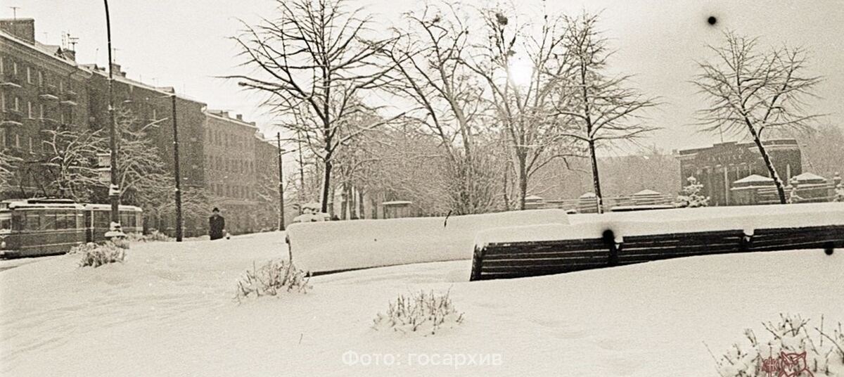 Укрытые сугробами скамейки и снежную «целину» были сняты в сквере возле стадиона «Балтика» на проспекте Мира в 1960-е годы. Автор фото — Б.М.Штерн.