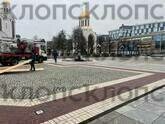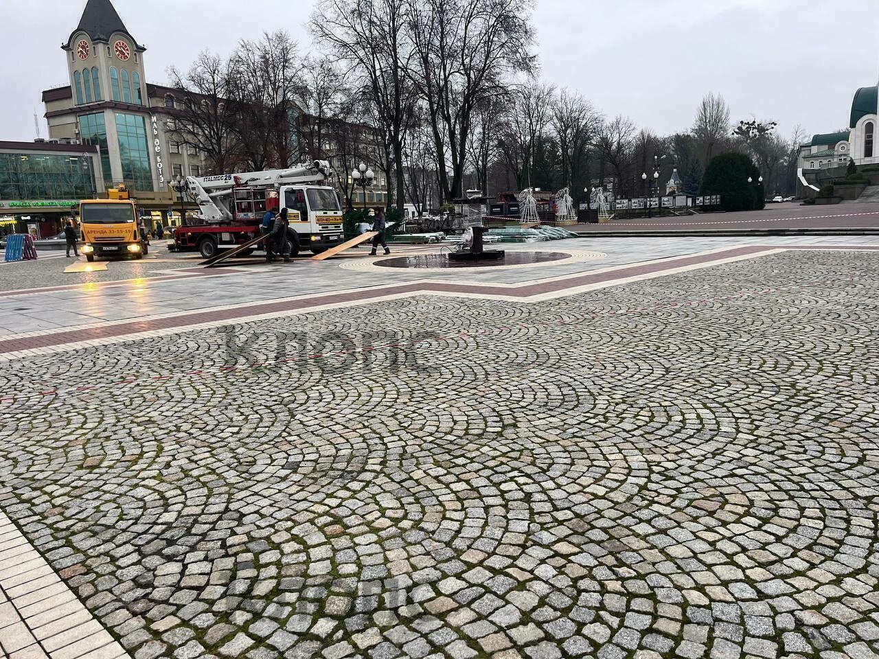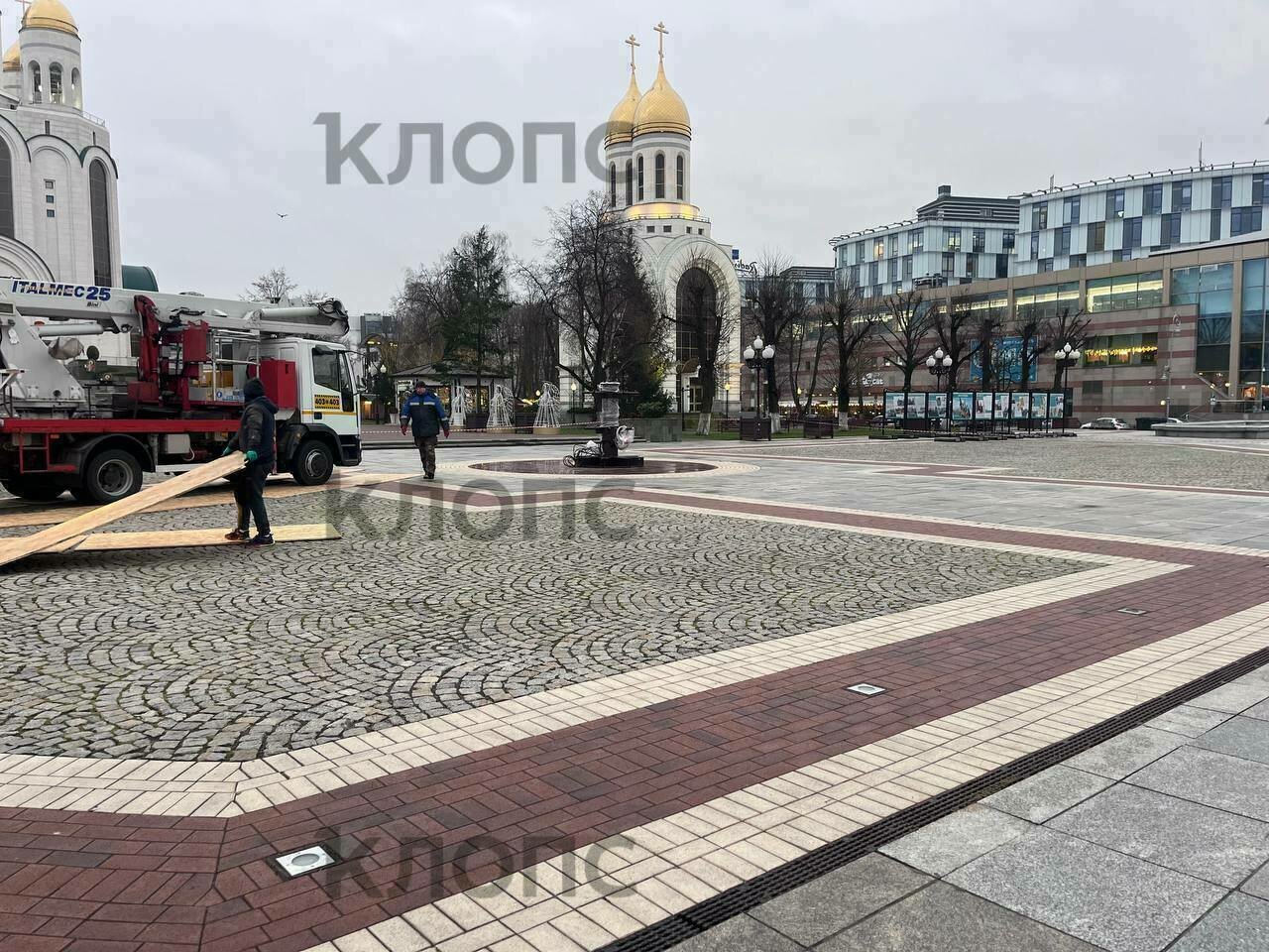 На площади уже установили металлическое основание будущей ёлки. Проход в центре частично перекрыт.