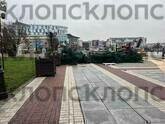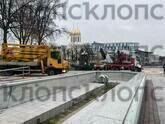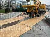 Накануне сюда доставили части конструкции. Утром прибыли две спецмашины с подъёмниками. Чтобы не повредить покрытие, на асфальт уложили защитные маты.