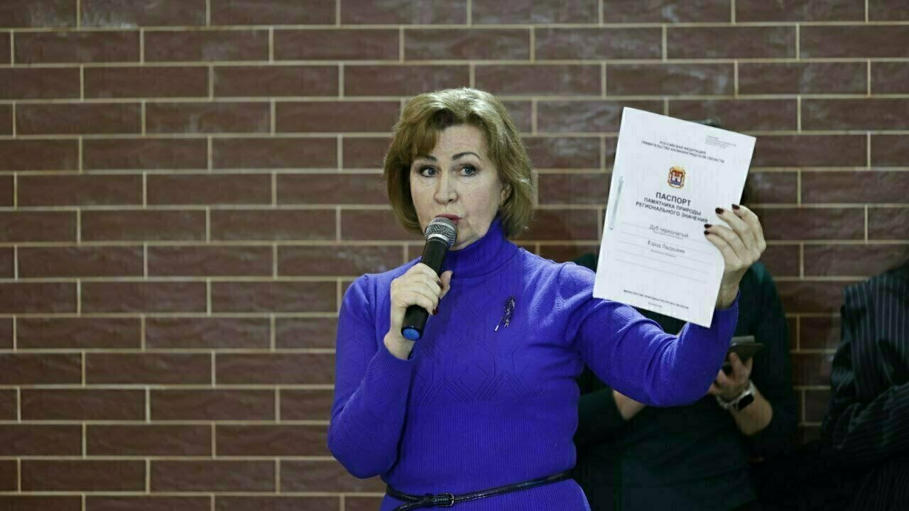 Возглавляющая в окружном Совете депутатов комиссию по вопросам культуры, образования Ольга Салимова на встрече с жителями Ладушкина передала Алексею Беспрозванных паспорт дуба.