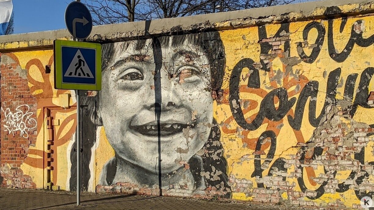 Известный в Калининграде объект стрит-арта, улыбающуюся девочку и надпись «Носи солнце в себе» на 9 Апреля, скоро снесут. Залитый краской мурал с изображением пожарного на Сельме, напротив, восстановили.