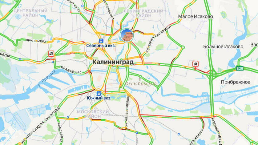 Движение затруднено на основных магистралях города, в том числе на Горького, Портовой, Железнодорожной, Гагарина, Невского, Черняховского, Фрунзе, 9 Апреля, Ленинском, Московском и Советском проспектах. Сообщается о двух авариях — на Радищева и Московском проспекте. Общая ситуация в Калининграде оценивается в семь баллов.