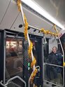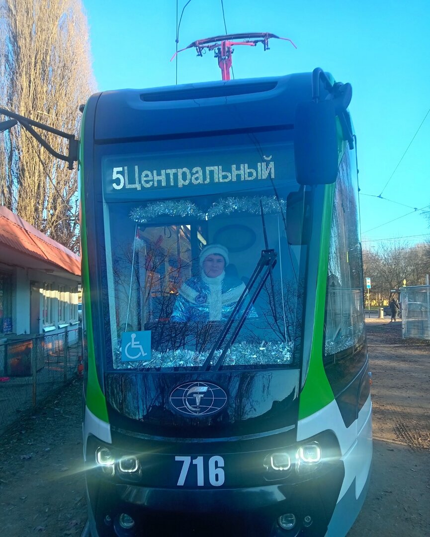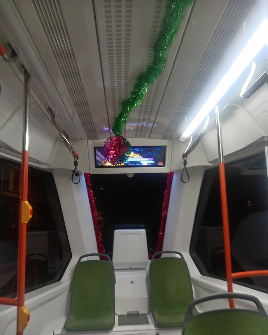 Другой вагон — «Корсар» (также бегает по пятому маршруту) украшен в новогоднем стиле, но внутри салона, зато за пультом управления — водитель в костюме Снегурочки.