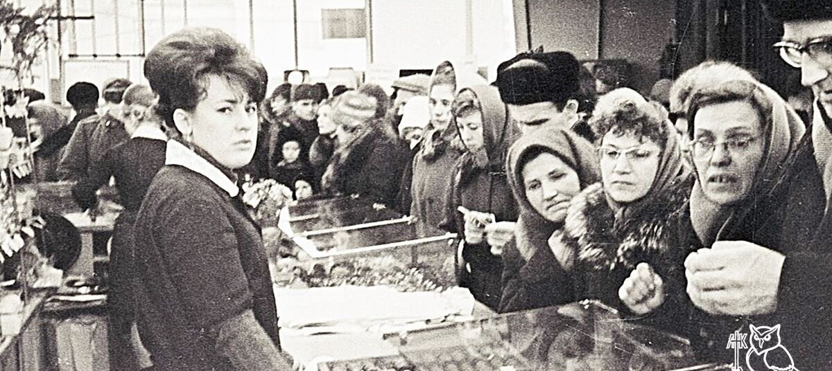 На первом фото изображён Центральный гастроном, а втором и третьем — многолюдные торговые площади. «По всей видимости, универмаг «Маяк», вид на который со стороны ул. Театральной присутствует и на 1-м снимке. Отметим, что зима 1965-1966 гг., однако, не была снежной!» — говорится в сообщении. Автор съёмки: Б.М.Штерн.