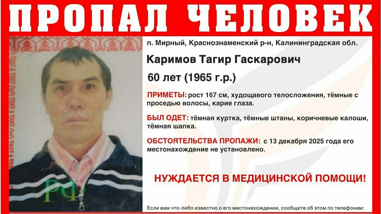 В посёлке Мирном Краснознаменского района пропал 60-летний мужчина. Об этом сообщает ПСО «Запад».