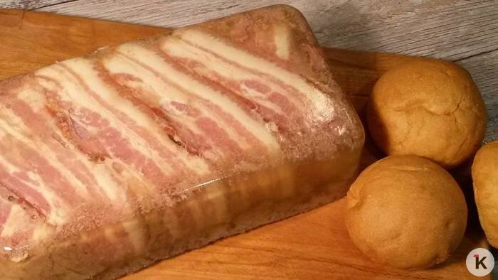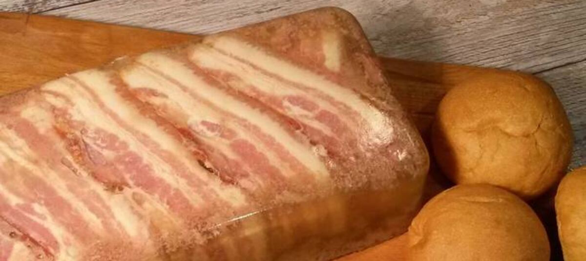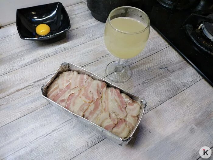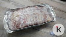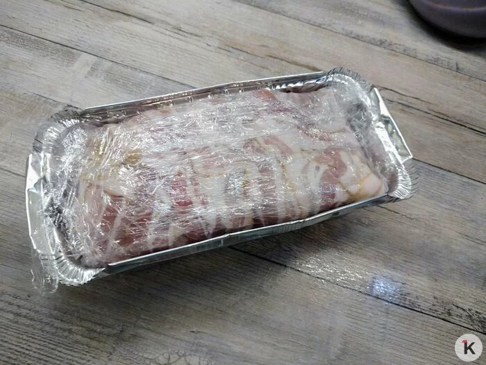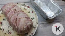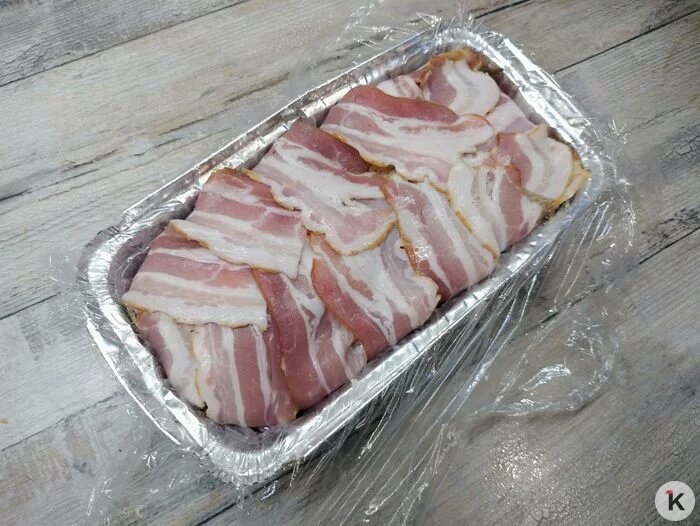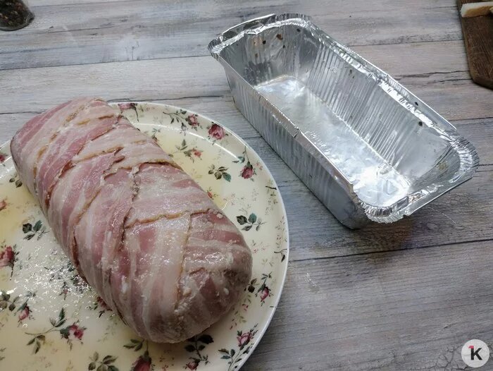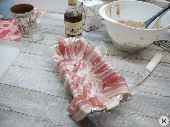 Форму (можно взять одноразовую из фольги) прямоугольную выстилаем пищевой плёнкой и выкладываем на дно внахлест ломтики бекона. Сверху — паштетная масса, закрываем её свободными хвостиками бекона, закрываем пленкой и отправляем в холодильник на ночь.
