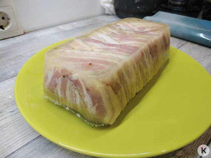 Разворачиваем паштет, сливаем жидкость, возвращаем его обратно в форму и заливаем желированным бульоном, так, чтоб был полностью покрыт. Накрываем фольгой и опять ставим в холодильник. Теперь уже — хотя бы на сутки, а лучше — на два дня.