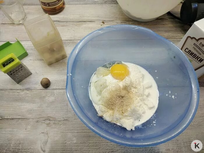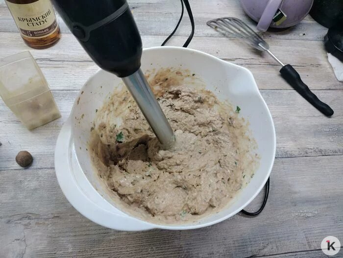К белому хлебу добавляем сливки, яйцо, белый перец и мускатный орех, хорошо вымешиваем. Объединяем обе массы и ещё раз взбиваем в блендере.