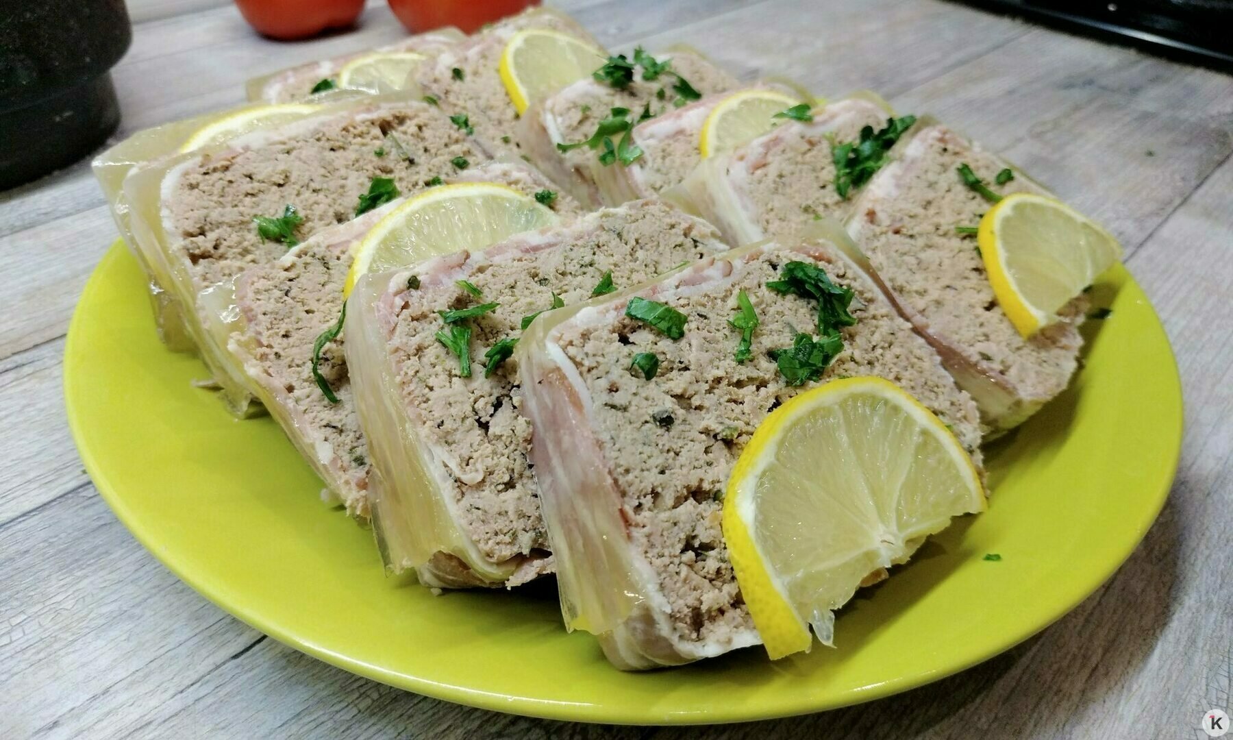 Готовый террин нарезваем на ломтики и подаём или как есть, или с тостами и булочками с хрустящей корочкой. Можно добавить тонкие ломтики лимона.
