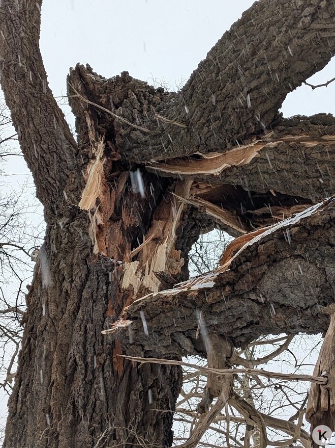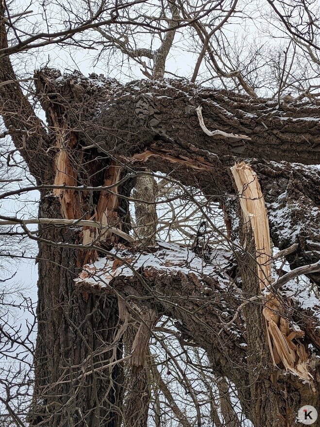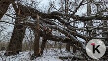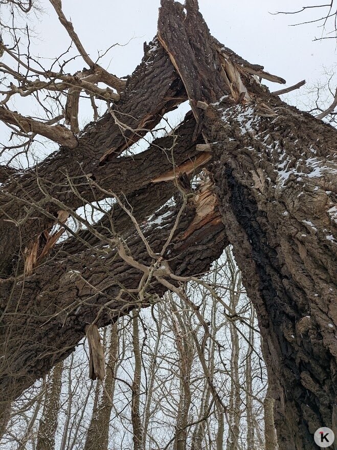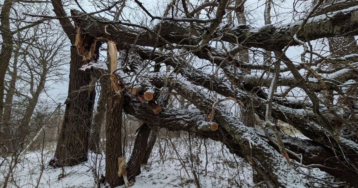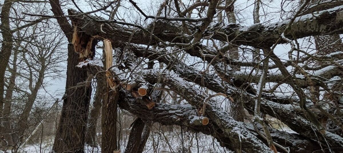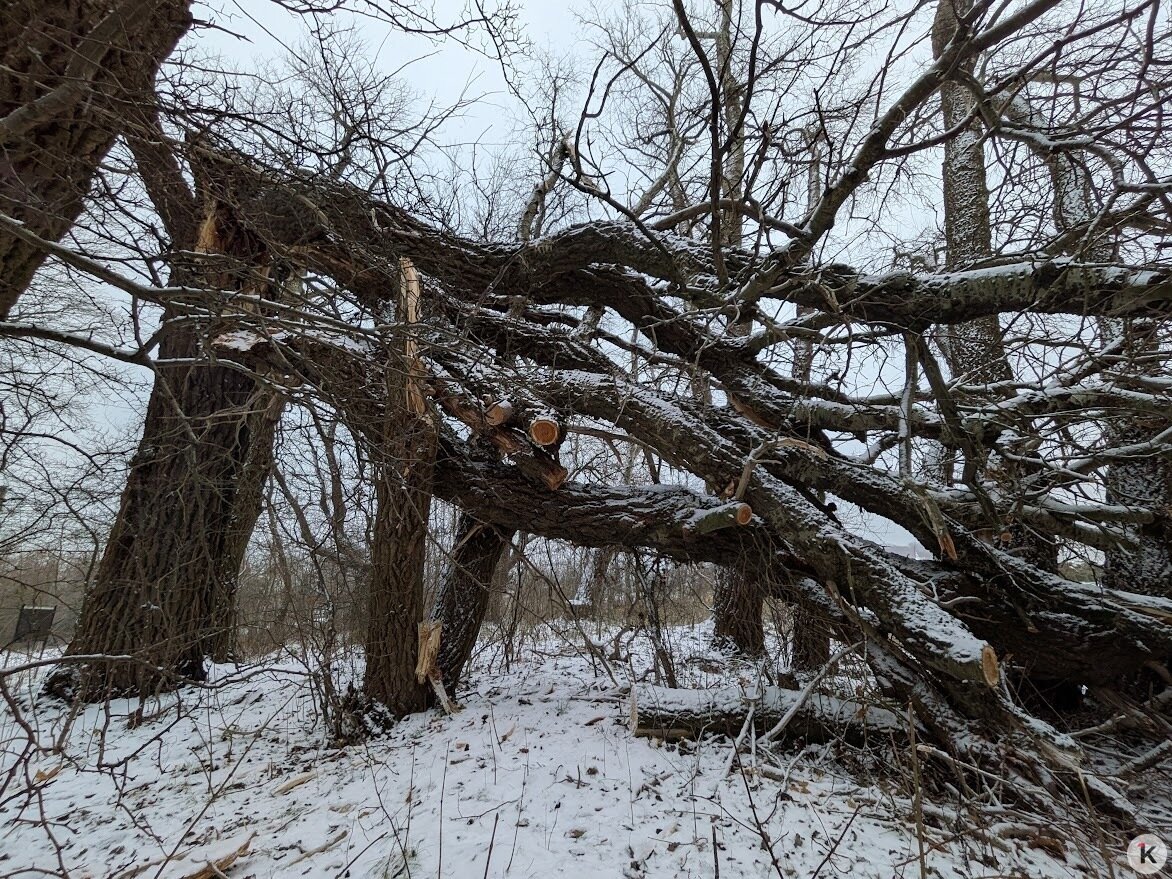 Огромное дерево, толщина ствола которого достигала два-три обхвата, повалило штормом, разыгравшимся в канун Нового года. Оно обломилось на высоте около трёх метров от земли и рухнуло, зацепив ещё и соседа.
