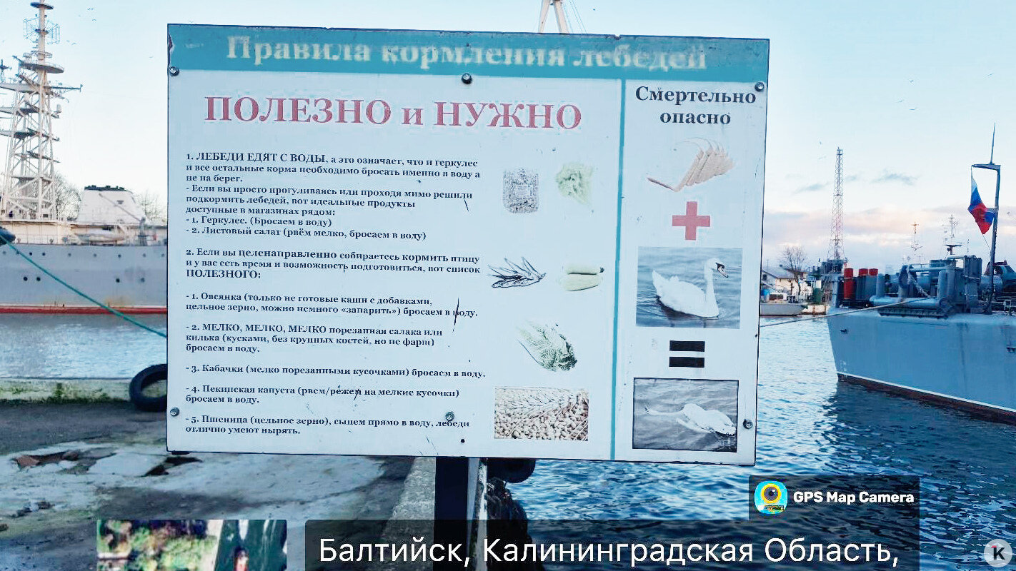 В настоящее время на набережной в Балтийске установлен информационный стенд, прямо предлагающий бросать в воду корм для птиц, игнорируя её загрязнение.