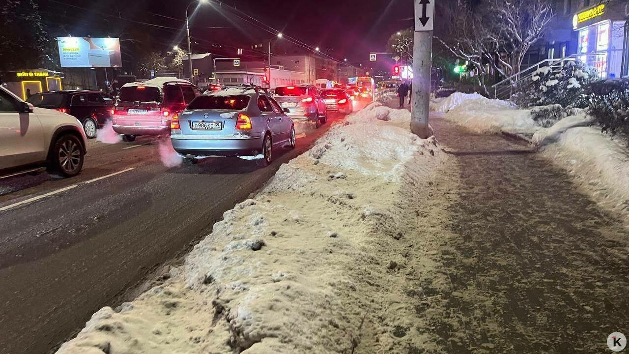 На более оживлённой калининградской улице — Юношеской — можно идти практически по сухому асфальту. На дороге рядом лежит слой снега.