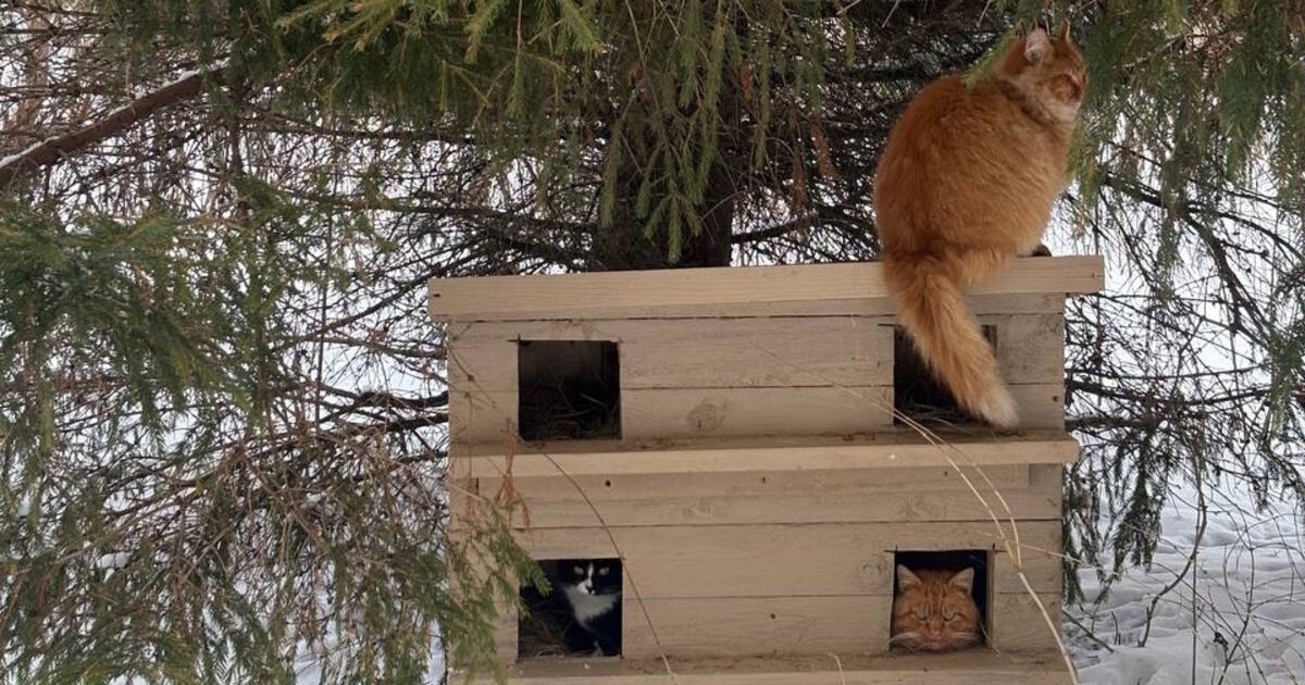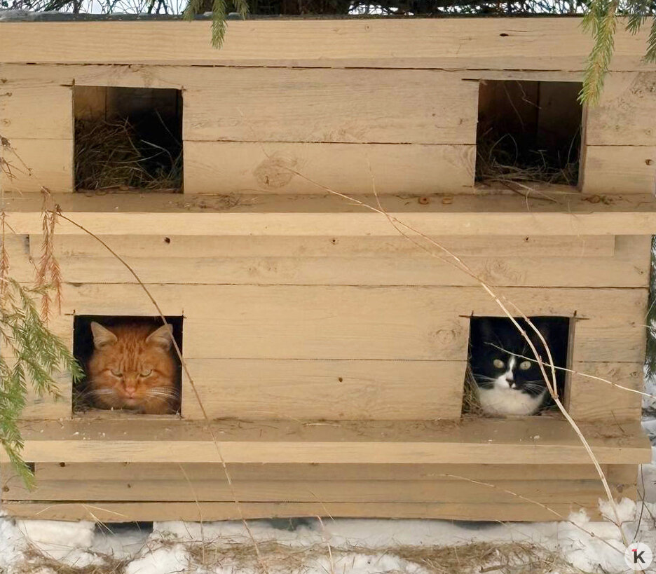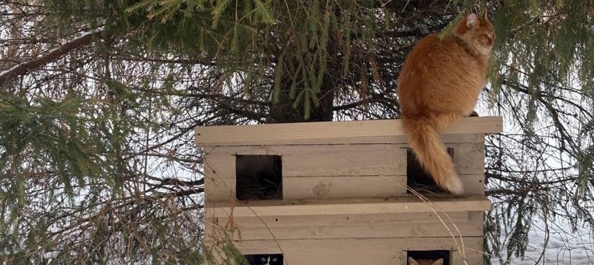 Кошачий особняк красуется в глубине двора под старой елью. Его стены сколочены из дерева и утеплены, а каждый этаж щедро устлан сеном. Подопечные идею восприняли на ура: из окошек высовываются довольные усатые мордочки, ещё кто-то постоянно восседает сверху.