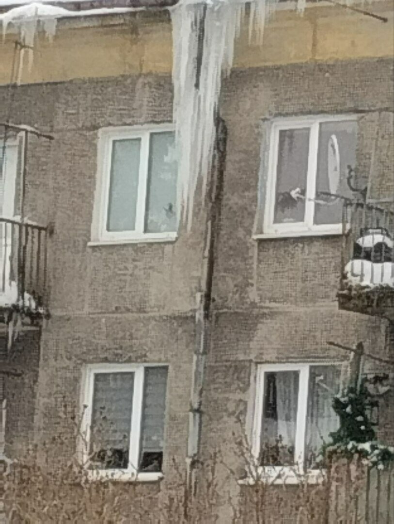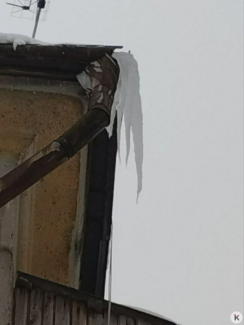 Фото, по её словам, сделано снизу, поэтому не передаёт истинного масштаба проблемы. Длина сосулек, говорит девушка, не меньше метра. А под ними — гололедица. «Они тают, пройти маленьким детям и пожилым невозможно!»