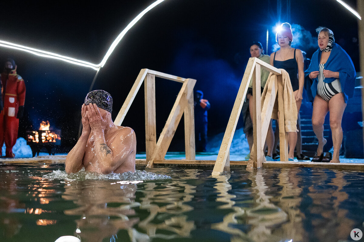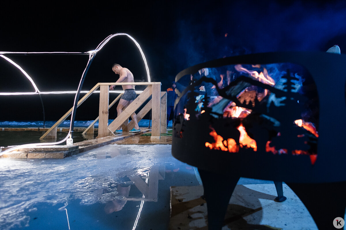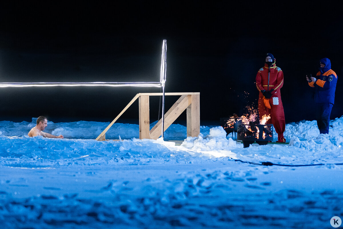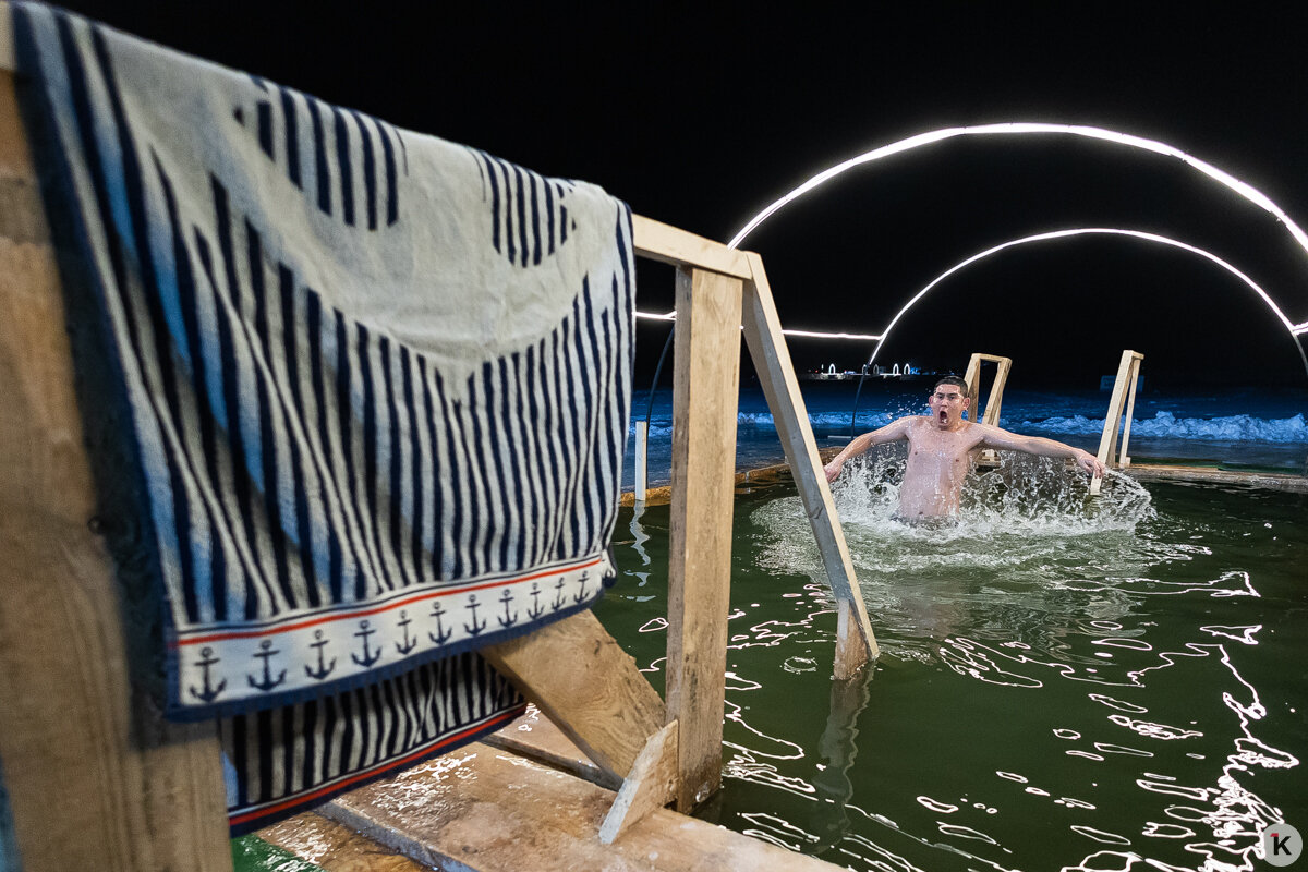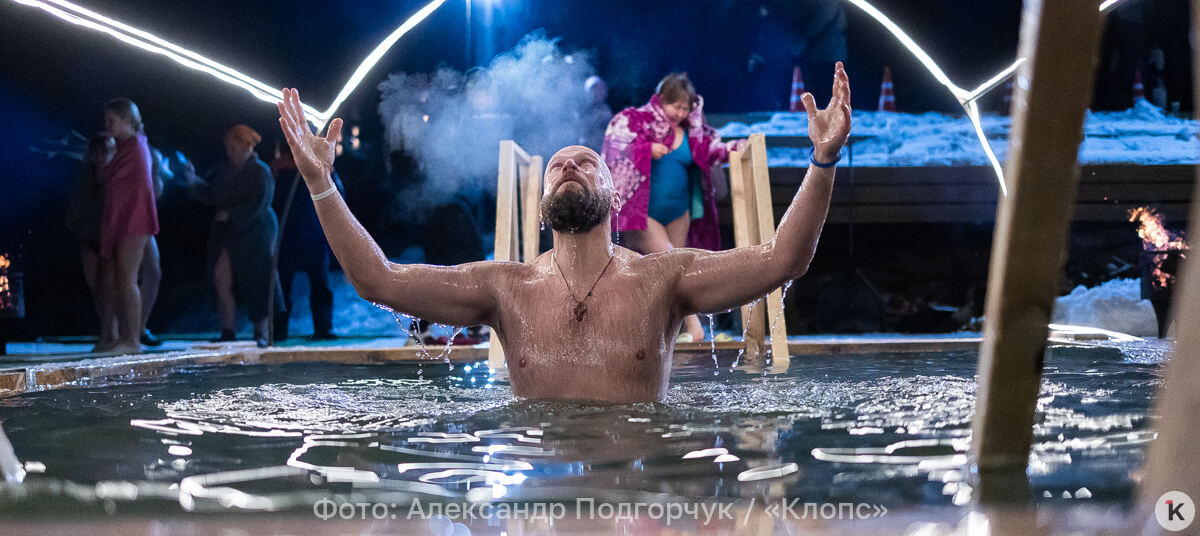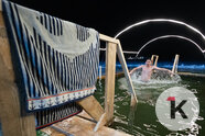 Во время празднования Крещения Господня любители народной традиции окунались в ледяную воду в специально оборудованных местах по всей Калининградской области. Одной из таких точек стал водоём в парке развлечений «Аистово» в одноимённом посёлке Гурьевского района. На мероприятии побывал фотокорреспондент «Клопс».