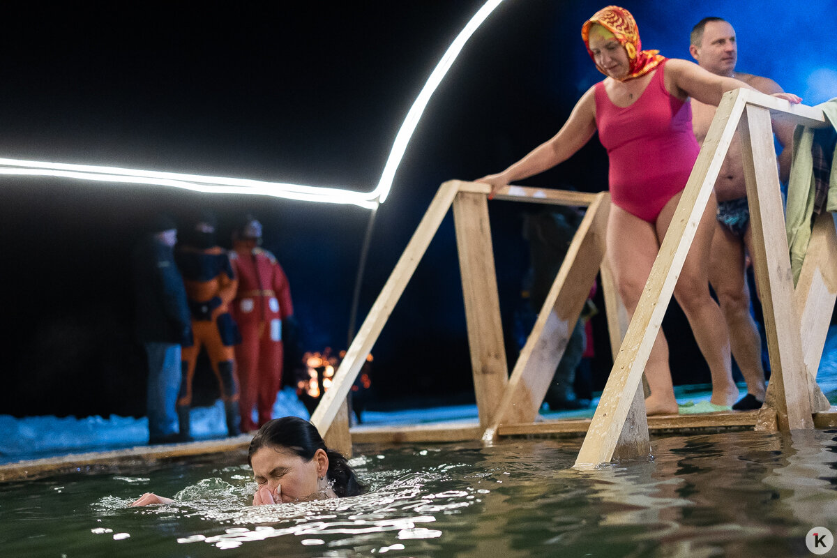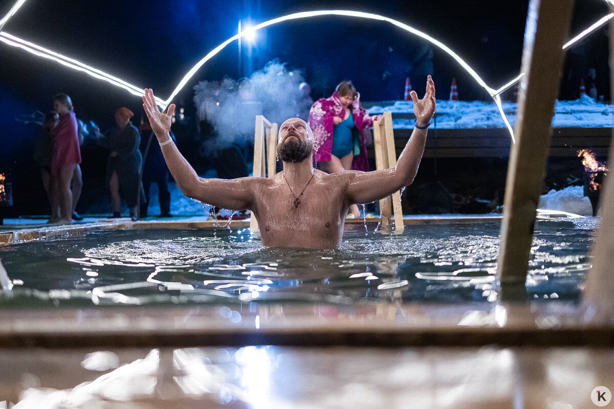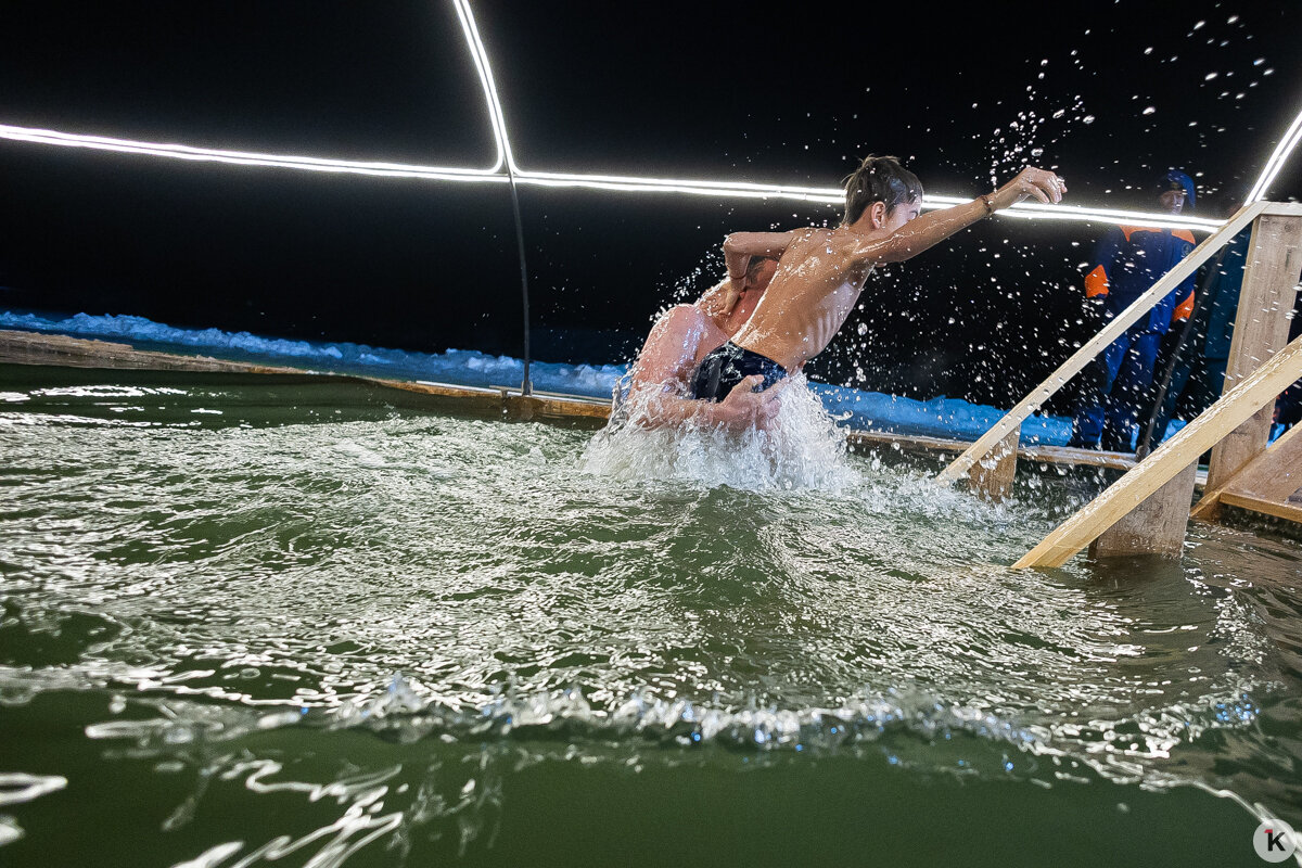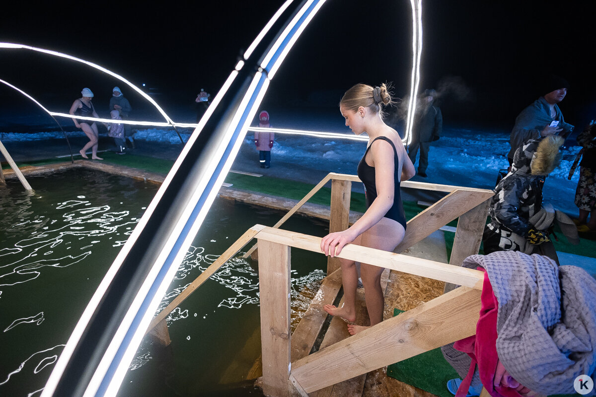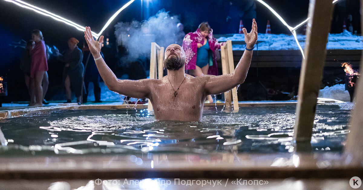 Во время празднования Крещения Господня любители народной традиции окунались в ледяную воду в специально оборудованных местах по всей Калининградской области. Одной из таких точек стал водоём в парке развлечений «Аистово» в одноимённом посёлке Гурьевского района. На мероприятии побывал фотокорреспондент «Клопс».