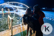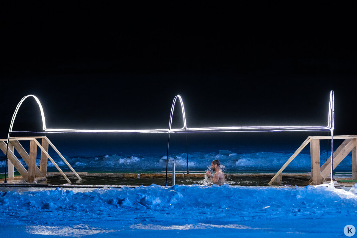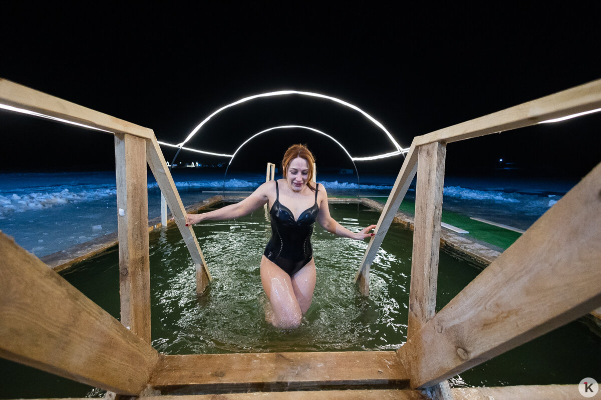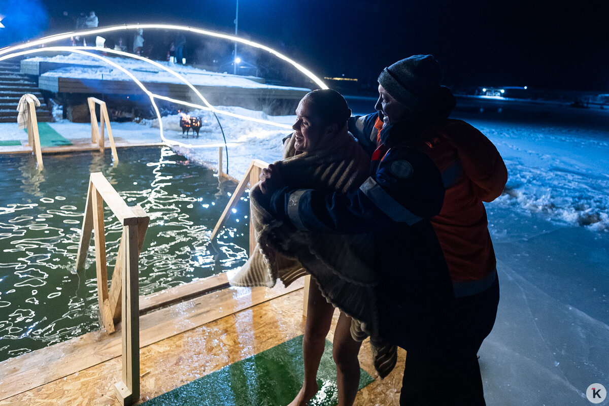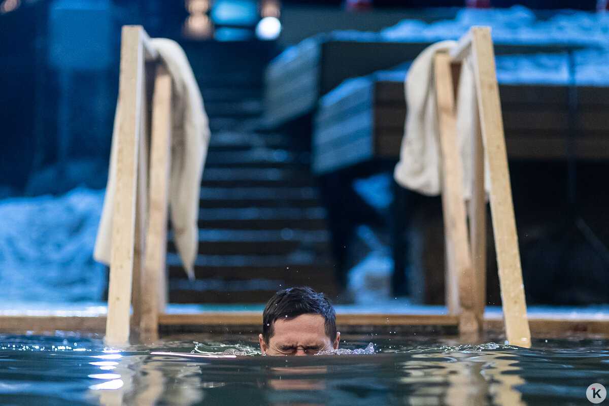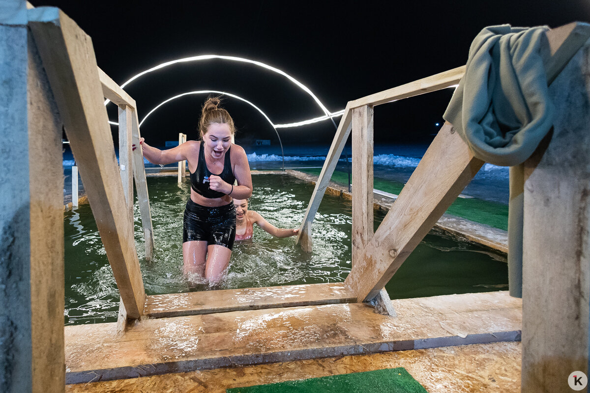 Во время празднования Крещения Господня любители народной традиции окунались в ледяную воду в специально оборудованных местах по всей Калининградской области. Одной из таких точек стал водоём в парке развлечений «Аистово» в одноимённом посёлке Гурьевского района. На мероприятии побывал фотокорреспондент «Клопс».