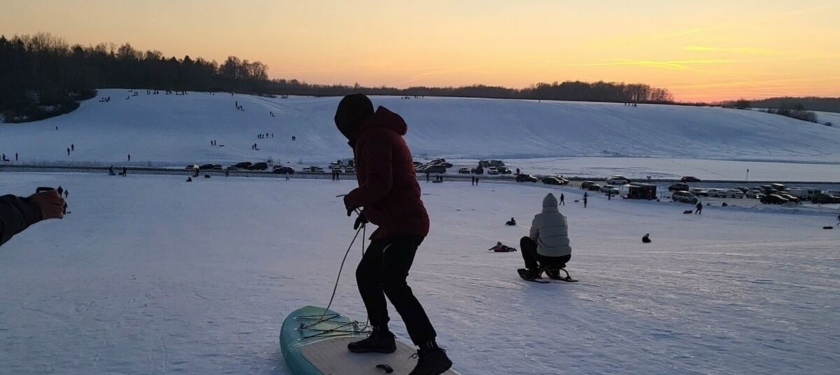 Калининградцы устроили покатушки на сапе с горок в Романово и записали видео. Об этом «Клопс» рассказал один из участников недавней субботней поездки Пётр Обухов.