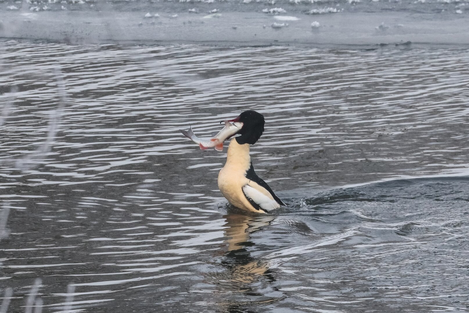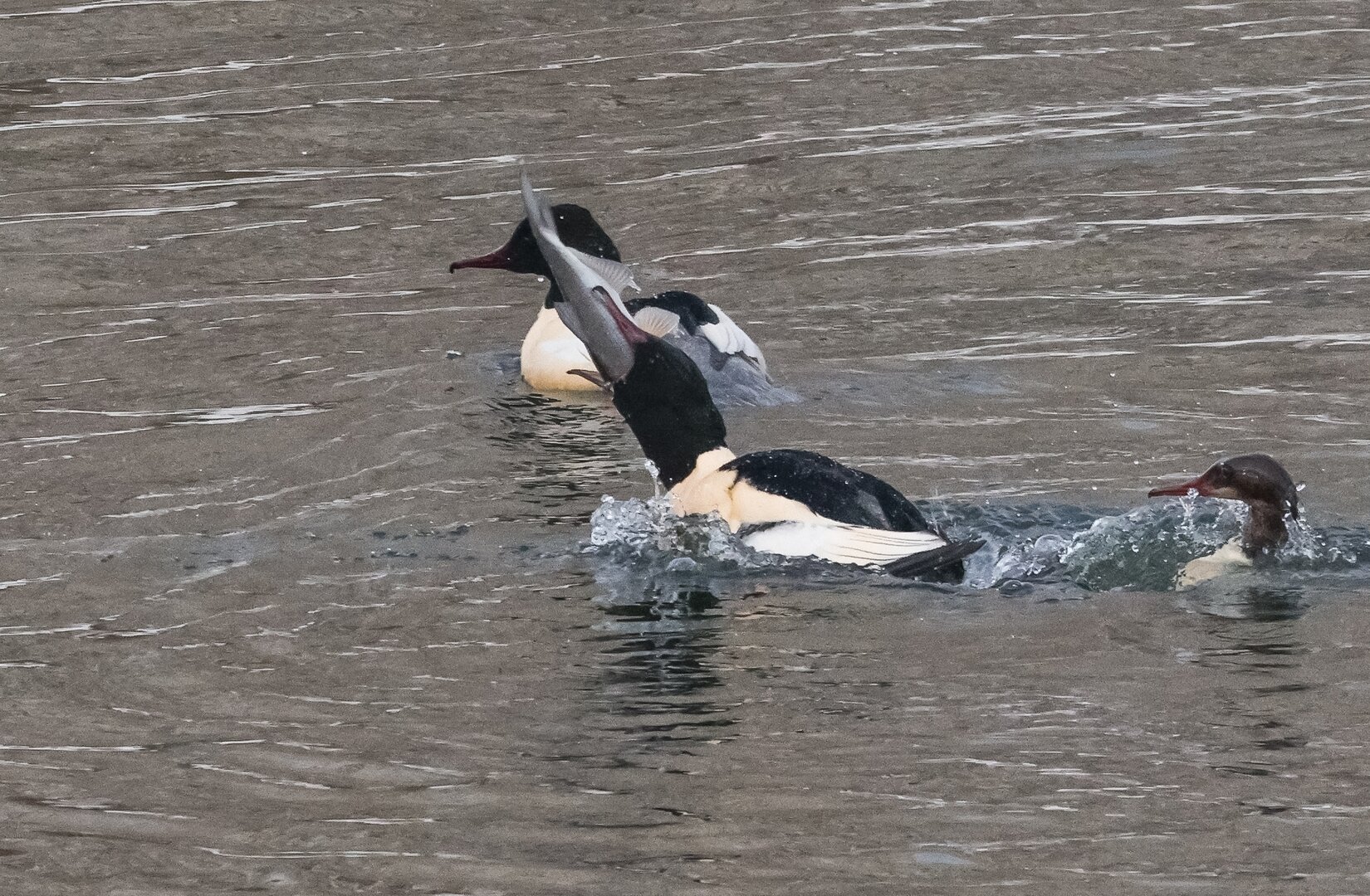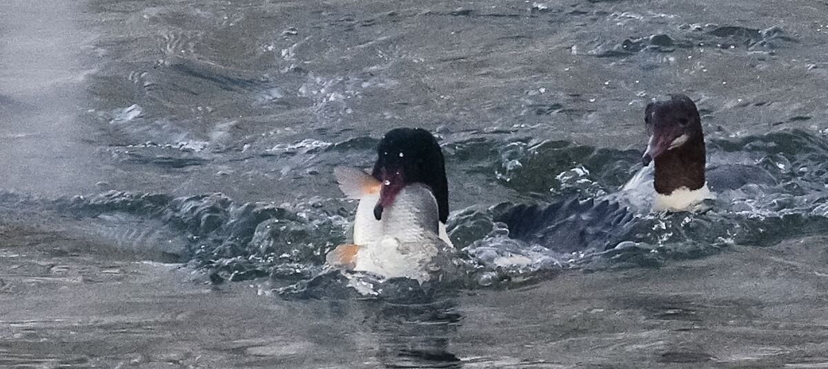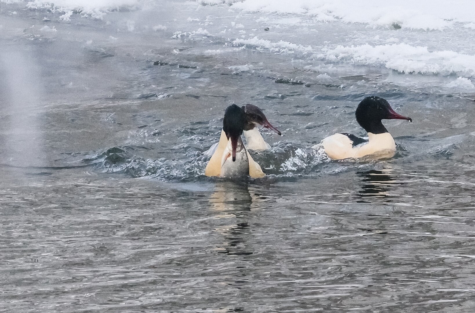 Свидетелем охоты (или рыбалки?) Юрий случайно стал утром в четверг, 22 января, проезжая на машине по берегу реки. Несколько крохалей (это крупная ныряющая птица из семейства утиных) выхватывали из воды и жадно заглатывали крупных рыбин. Иной раз добыча была так велика, что даже не помещалась в клюве!