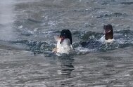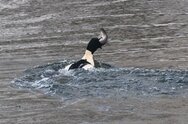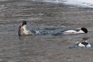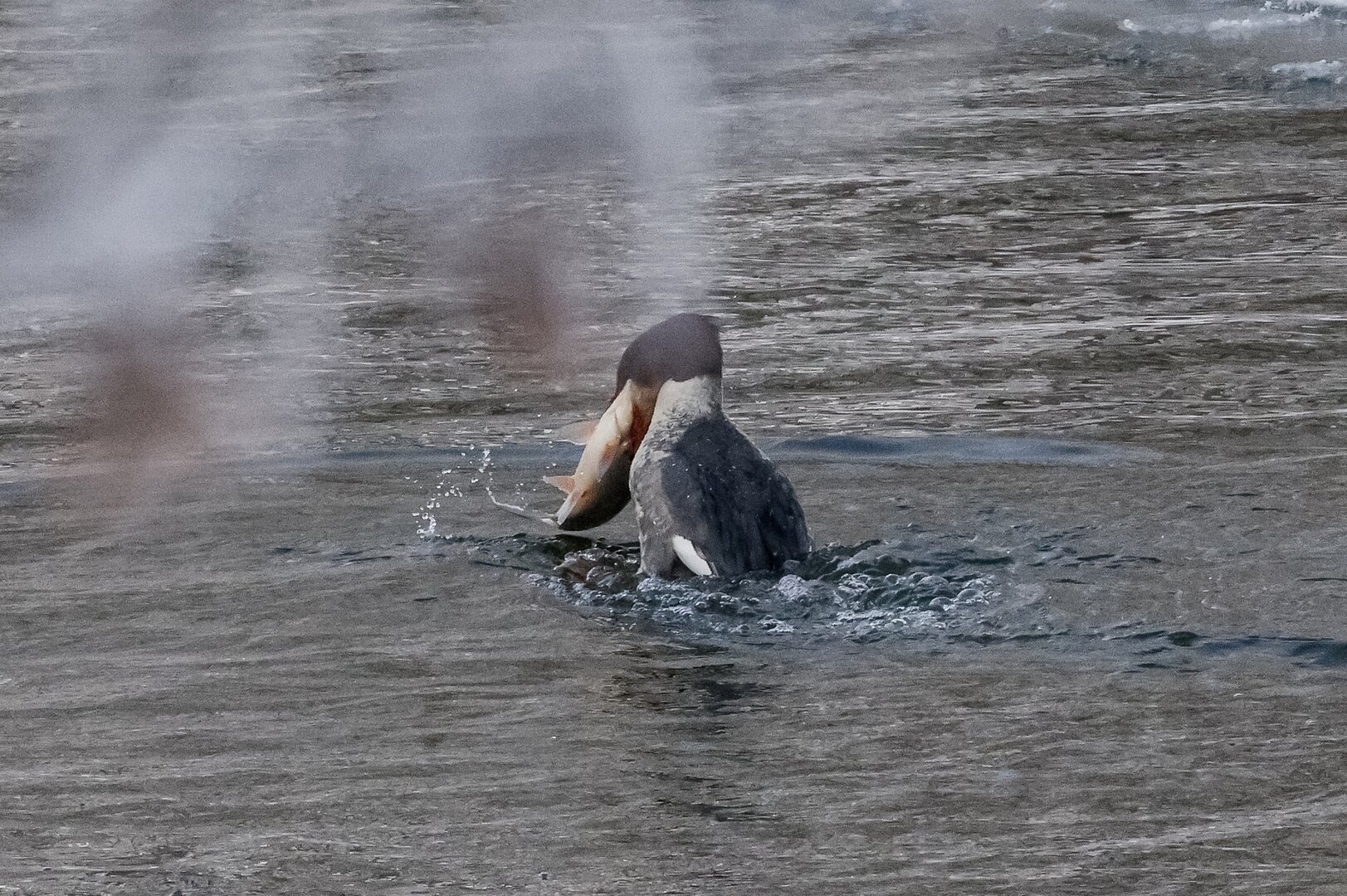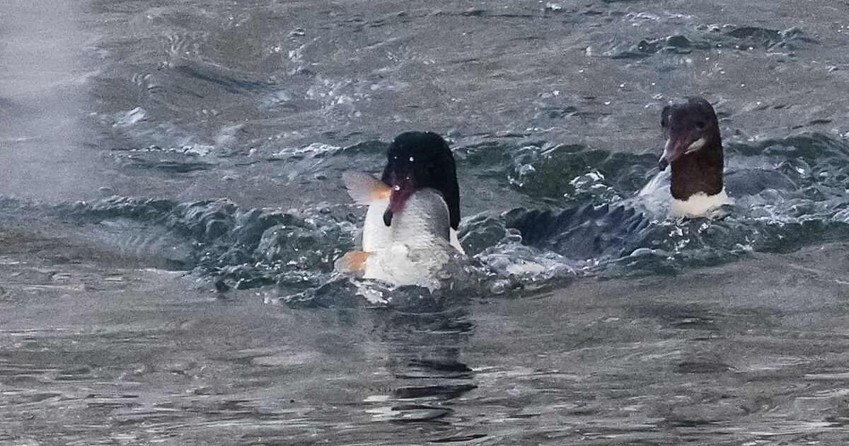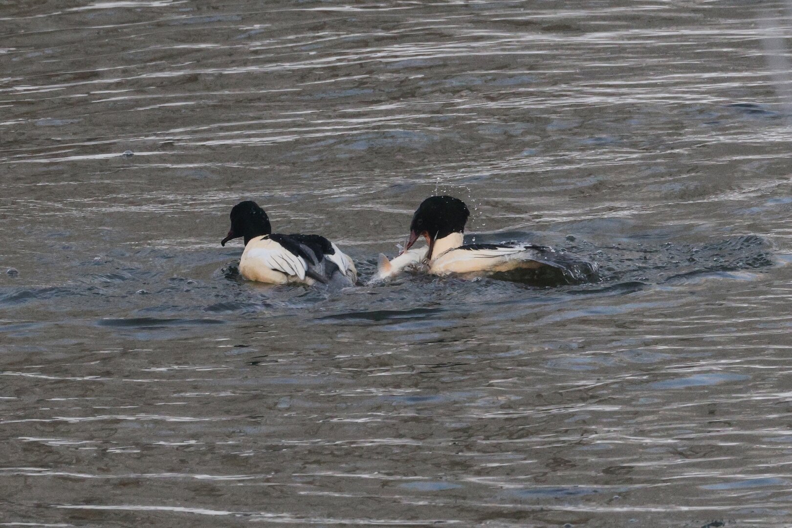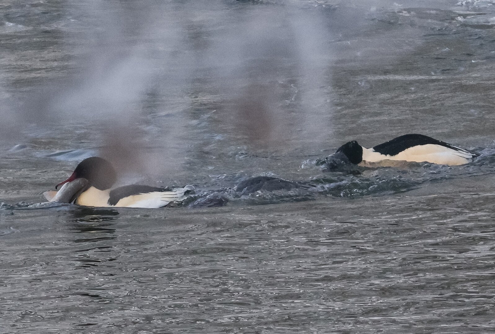 Свидетелем охоты (или рыбалки?) Юрий случайно стал утром в четверг, 22 января, проезжая на машине по берегу реки. Несколько крохалей (это крупная ныряющая птица из семейства утиных) выхватывали из воды и жадно заглатывали крупных рыбин. Иной раз добыча была так велика, что даже не помещалась в клюве!