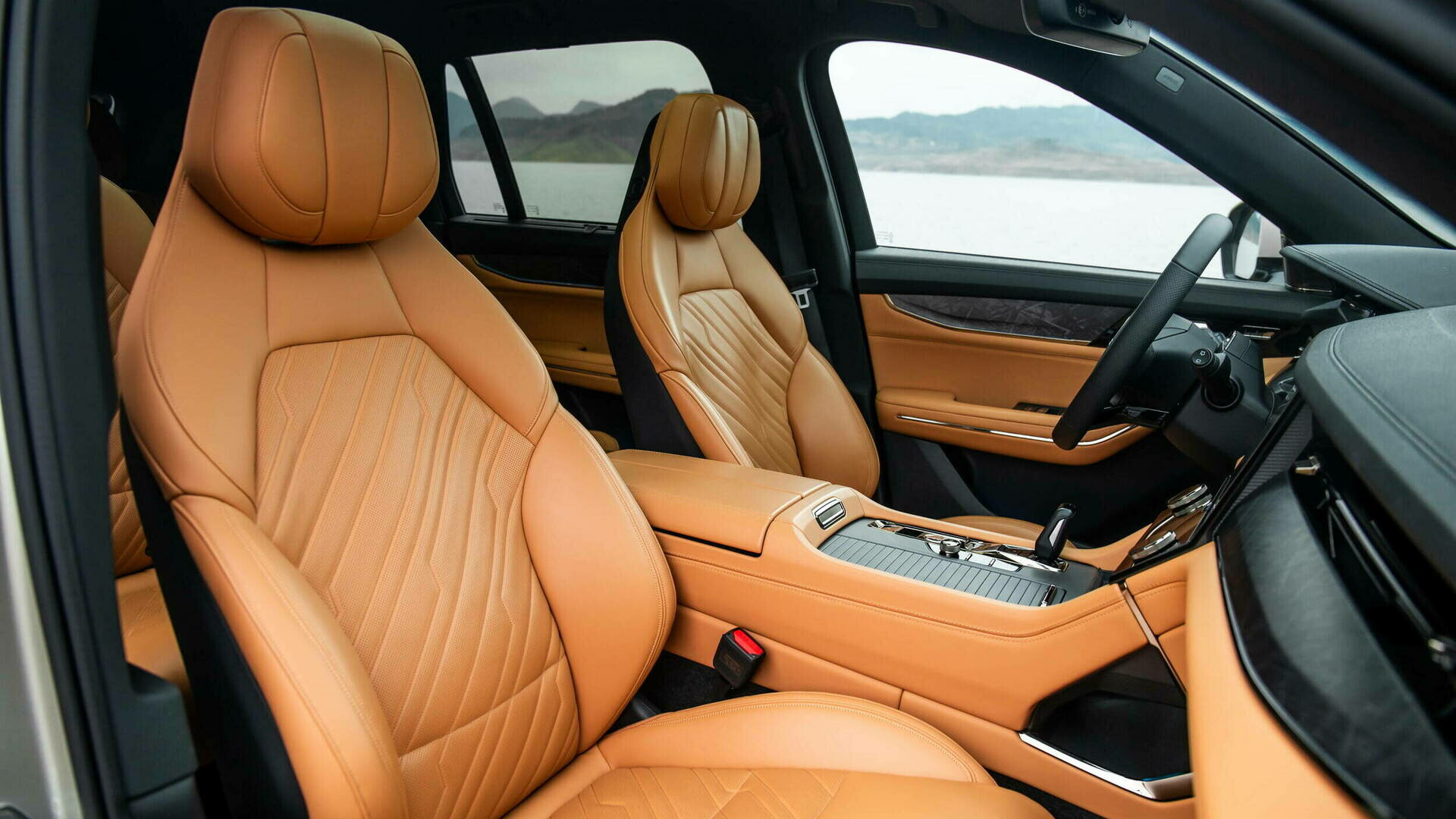 Внутри салон отделан кожей наппа, натуральный алюминий, атмосферная подсветка с 64 цветами — всё, как положено в премиум-классе.