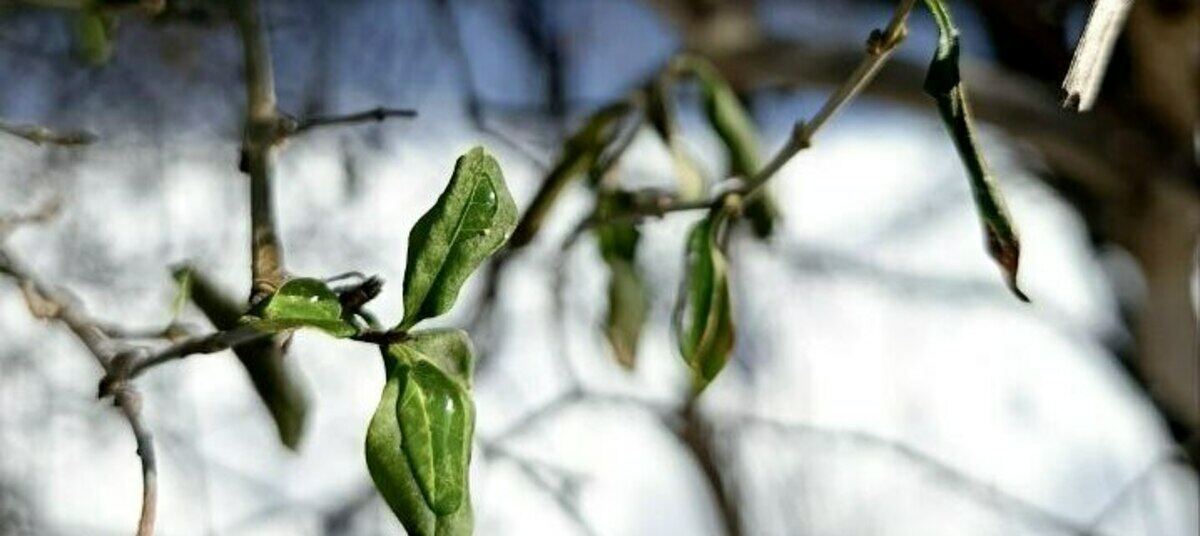 «Никакие листья в мороз, конечно, не распускаются, — объяснила Елена. — Это листья прошлогодние. Есть такое понятие, как вечнозелёные и полувечнозелёные лиственные кустарники. На них — на самшите, например — листья полностью остаются на зиму. Или только часть листьев может остаться, а часть отпадает (у нас часто так себя ведёт бирючина)».