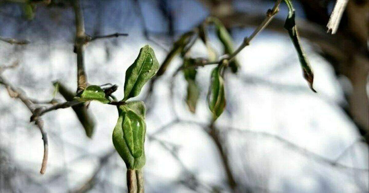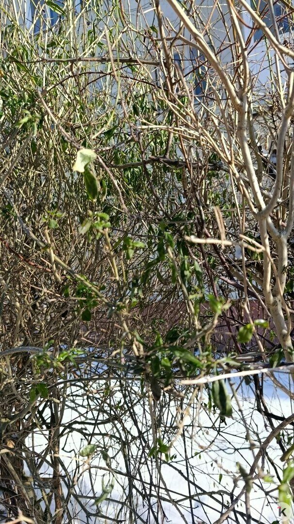 Куст, на ветках которого несмотря на мороз красуются нежные ярко-зелёные листики, сфотографировал читатель «Клопс». Своим наблюдением он поделился с редакцией.