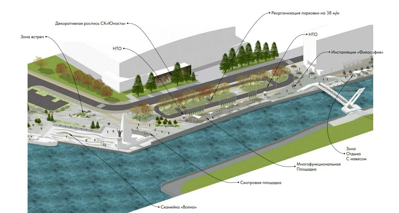 Проект также должен предусматривать озеленение территории, размещение систем «Безопасного города» и других коммуникаций, необходимых для комфорта горожан. Кроме того, на набережной планируют выделить несколько мест под нестационарные торговые объекты.