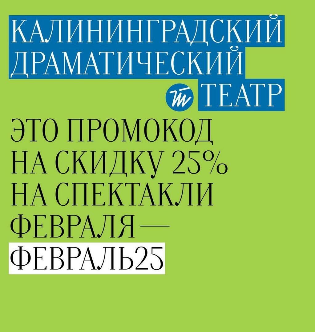 Ежемесячная акция Калининградского драматического театра пройдёт 5 февраля — только в этот день билеты в театр можно купить со скидкой 25% по промокоду «ФЕВРАЛЬ25».