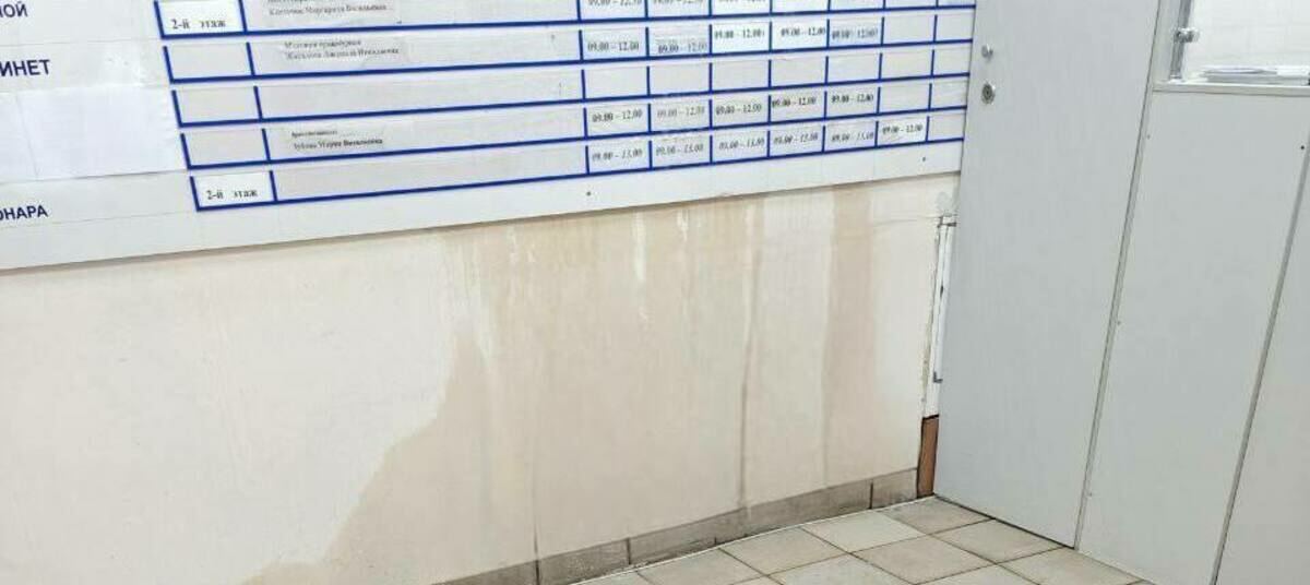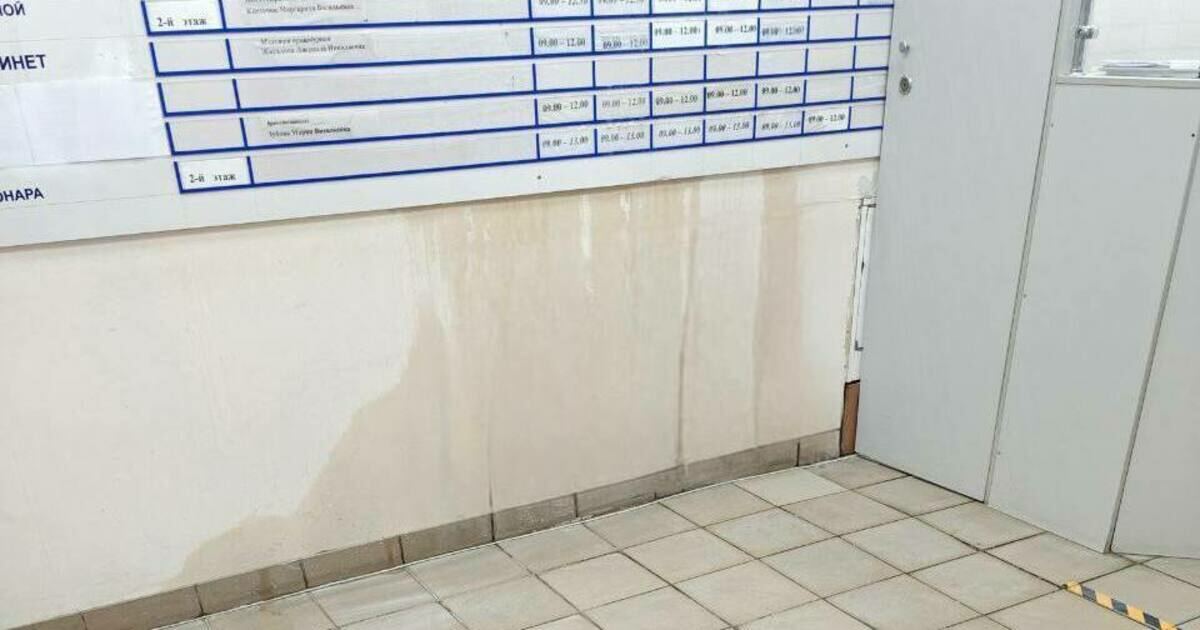 Как рассказали «Клопс» в поликлинике, «сорвало кран на трубе»: «Специалист административно-хозяйственного отдела устранил поломку. ПВХ-панели с потолка сняли для замены, стены просушат и в понедельник покрасят».
