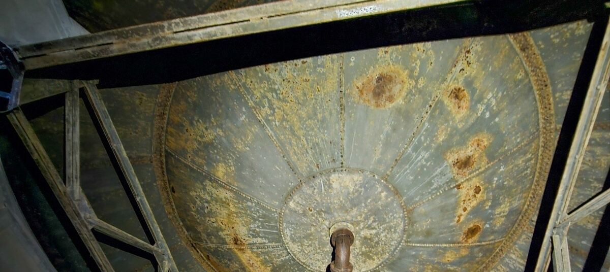 «Внутри скрываются целых два резервуара для воды! Это была передовая для своего времени система: нижний резервуар объёмом около 500 кубометров и верхний — на 513 кубометров, которые работали вместе и обеспечивали водой верхние этажи домов», — рассказывает Женяй.
