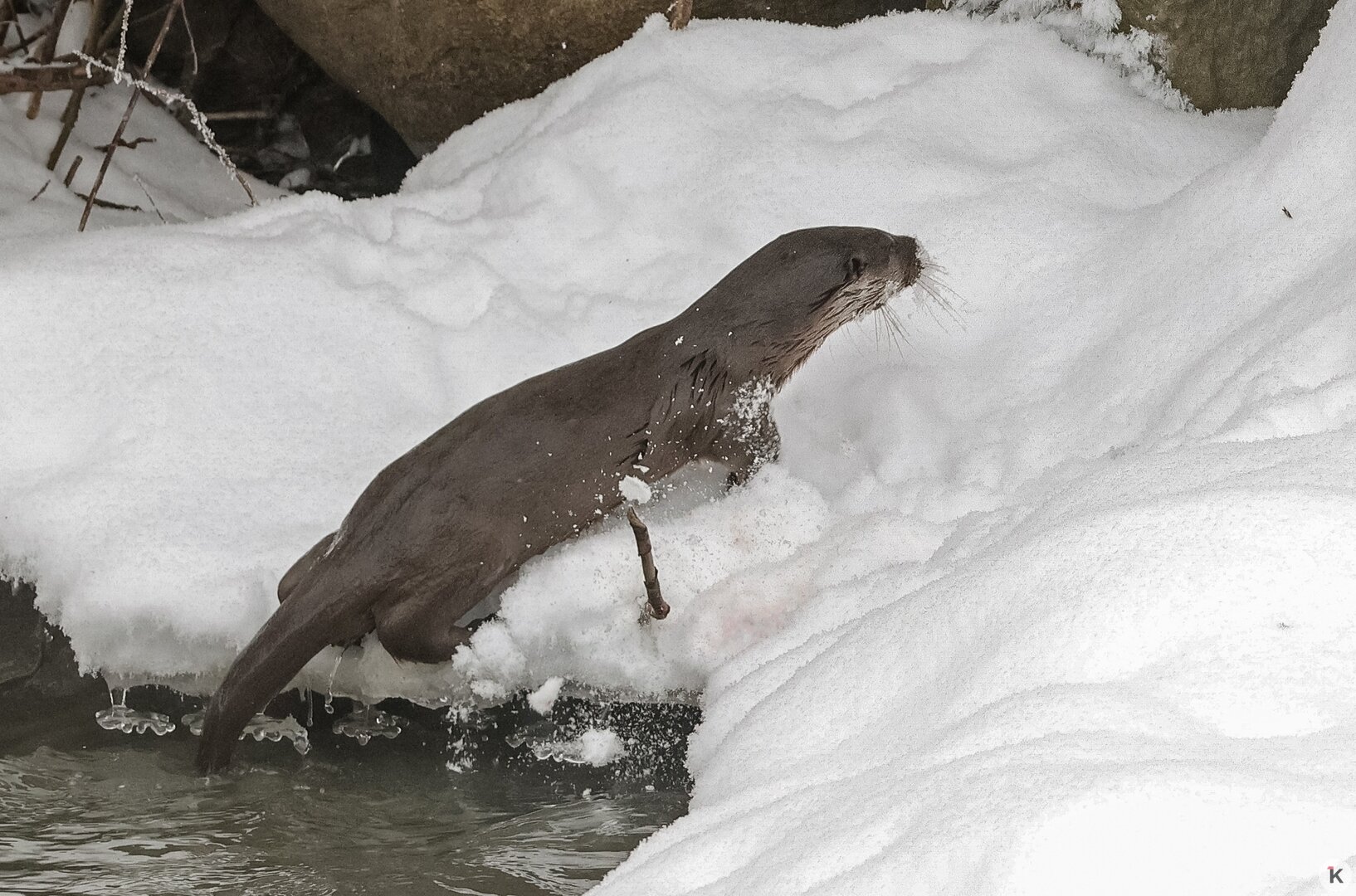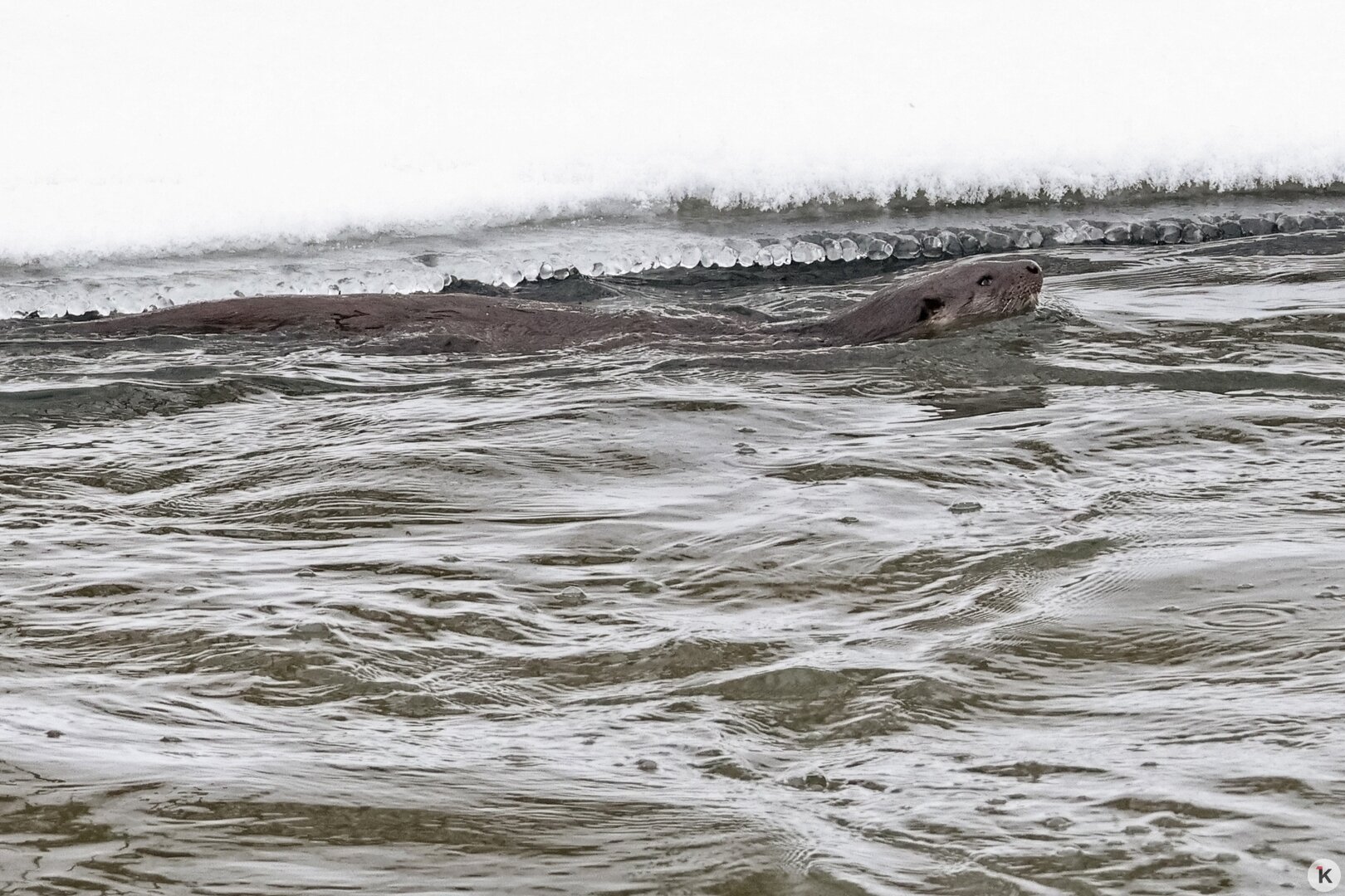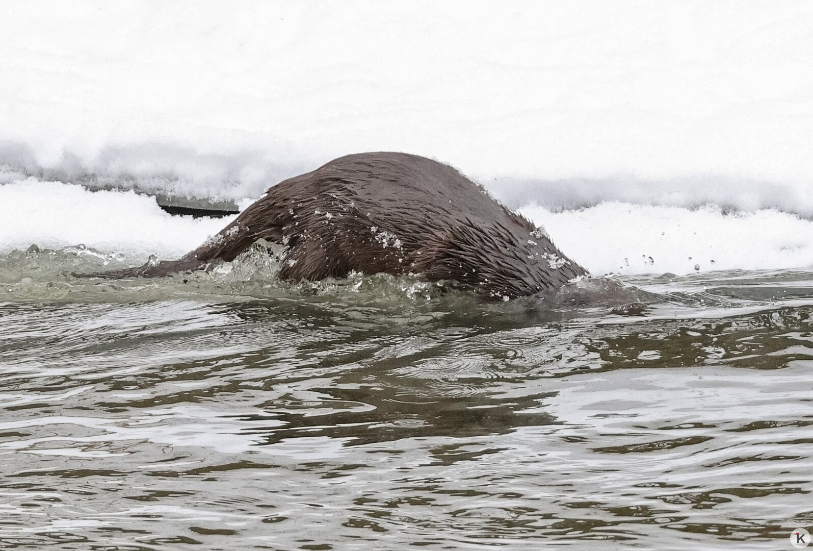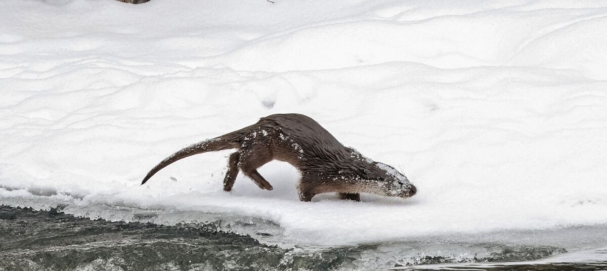 На Анграпе под Черняховском местный житель Юрий Таркин поймал в объектив охотящуюся выдру, слегка припорошённую снежком. Как рассказал «Клопс» сам фотограф, зверька в этом месте он наблюдал впервые.