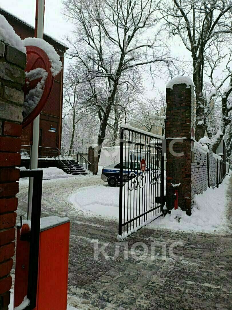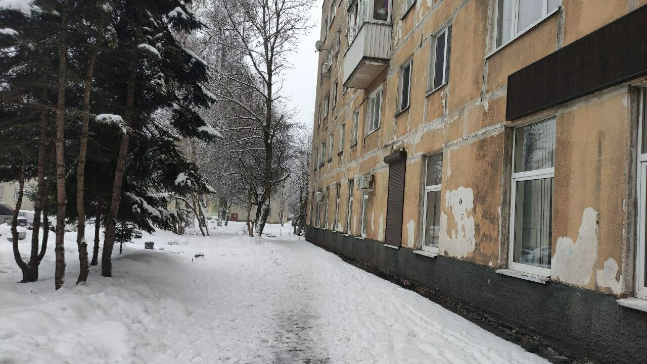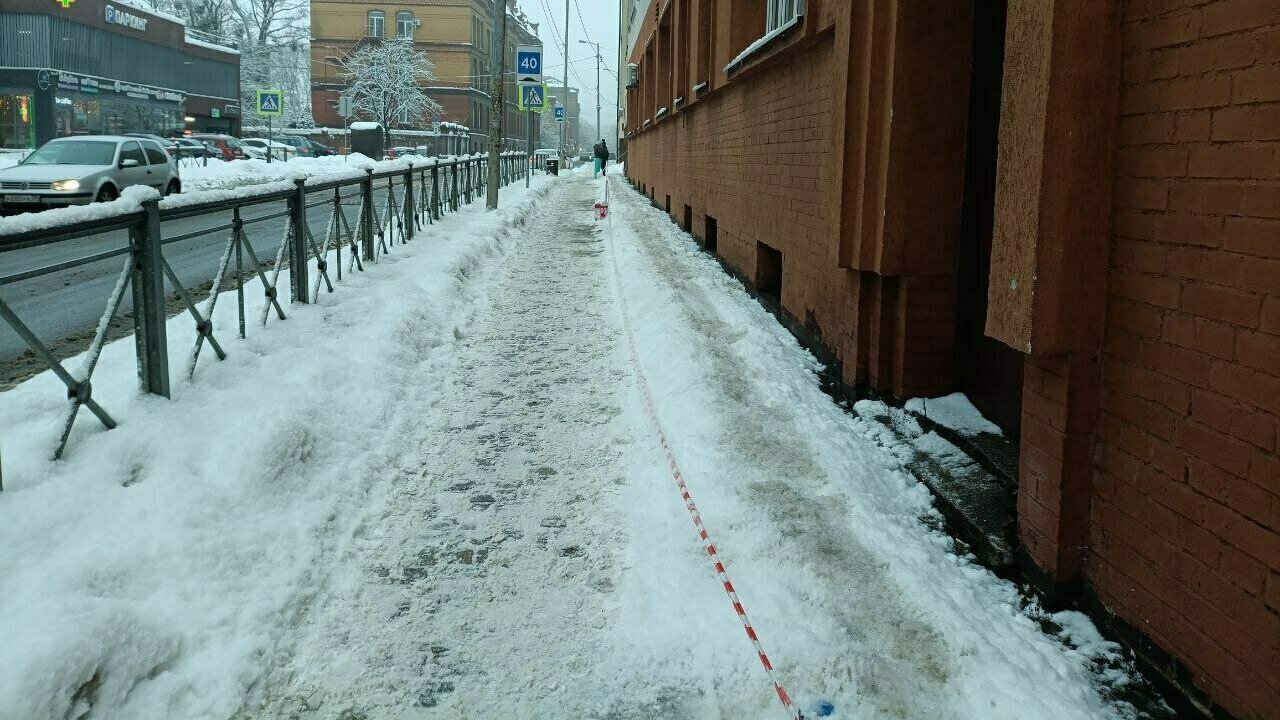 У здания всё в снегу, есть только несколько узких тропок, протоптанных пешеходами. Рядом — снежная каша и лёд. Часть тротуаров огорожена от сосулек и снега с крыш.